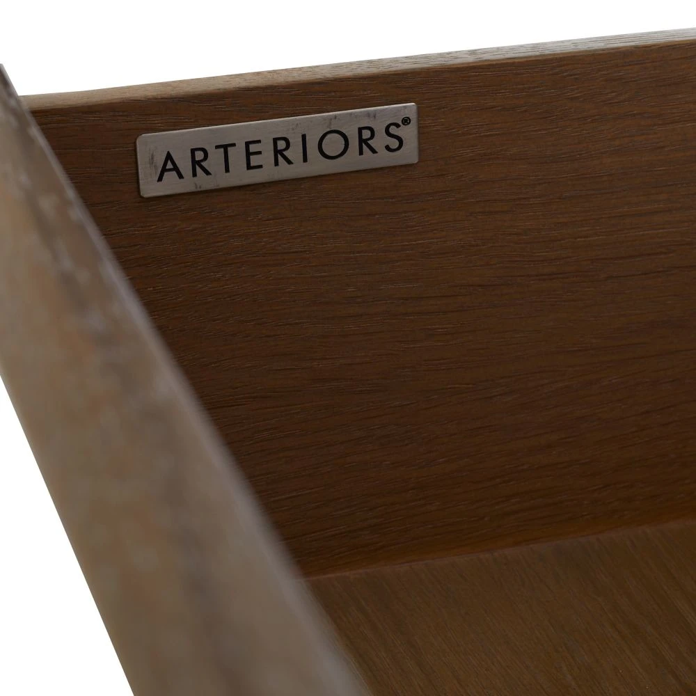 The Lafayette credenza brings interest and charm with an unexpected silhouette. Figural ofram veneer in chateau gray creates a dynamic sunburst pattern on the cabinet face, met by an opposing horizontal pattern on the top. Integrated textural hardware of bronze brass creates a focal point to tie this striking piece together. A metal parting rail wraps around the case, while inside each cabinet space is a single removable shelf. Finish will vary.