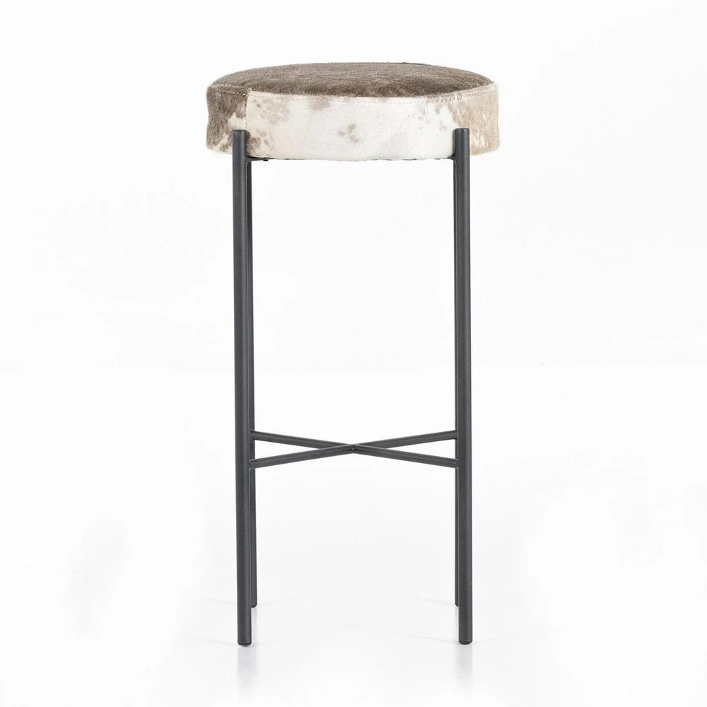 Slim and airy, gunmetal-finished iron legs form a cradle-style frame for speckled hide seating, perfectly sized for the bar. No two hides are the same. A variance in hide color, shape, pattern and hair length is to be expected, reflective of natural materials.