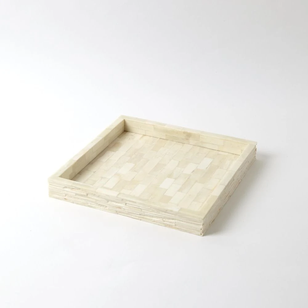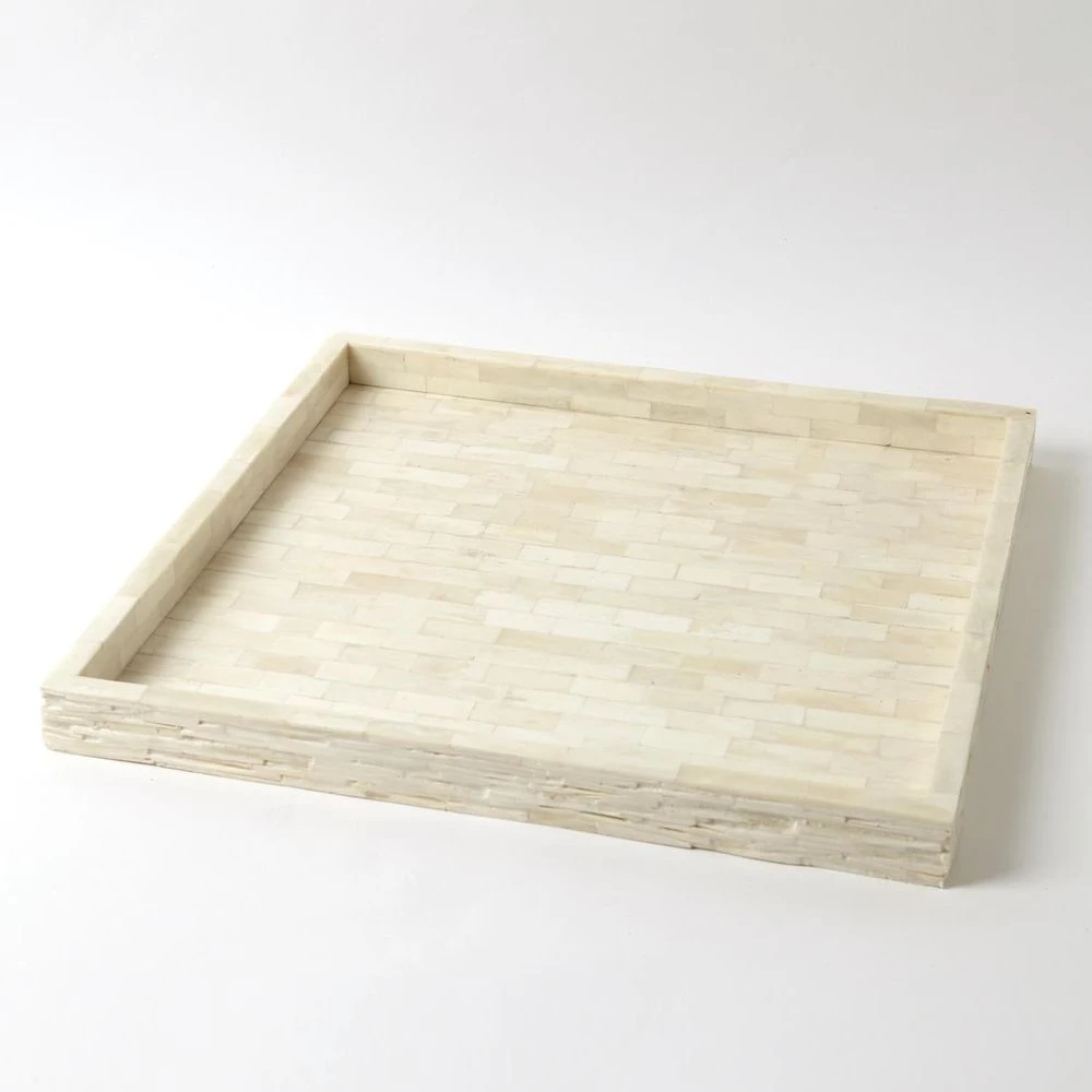 Hand-hewn, chiseled bone galleries are juxtaposed with smooth bone inlay on the tray’s inner surfaces. Available in three sizes.