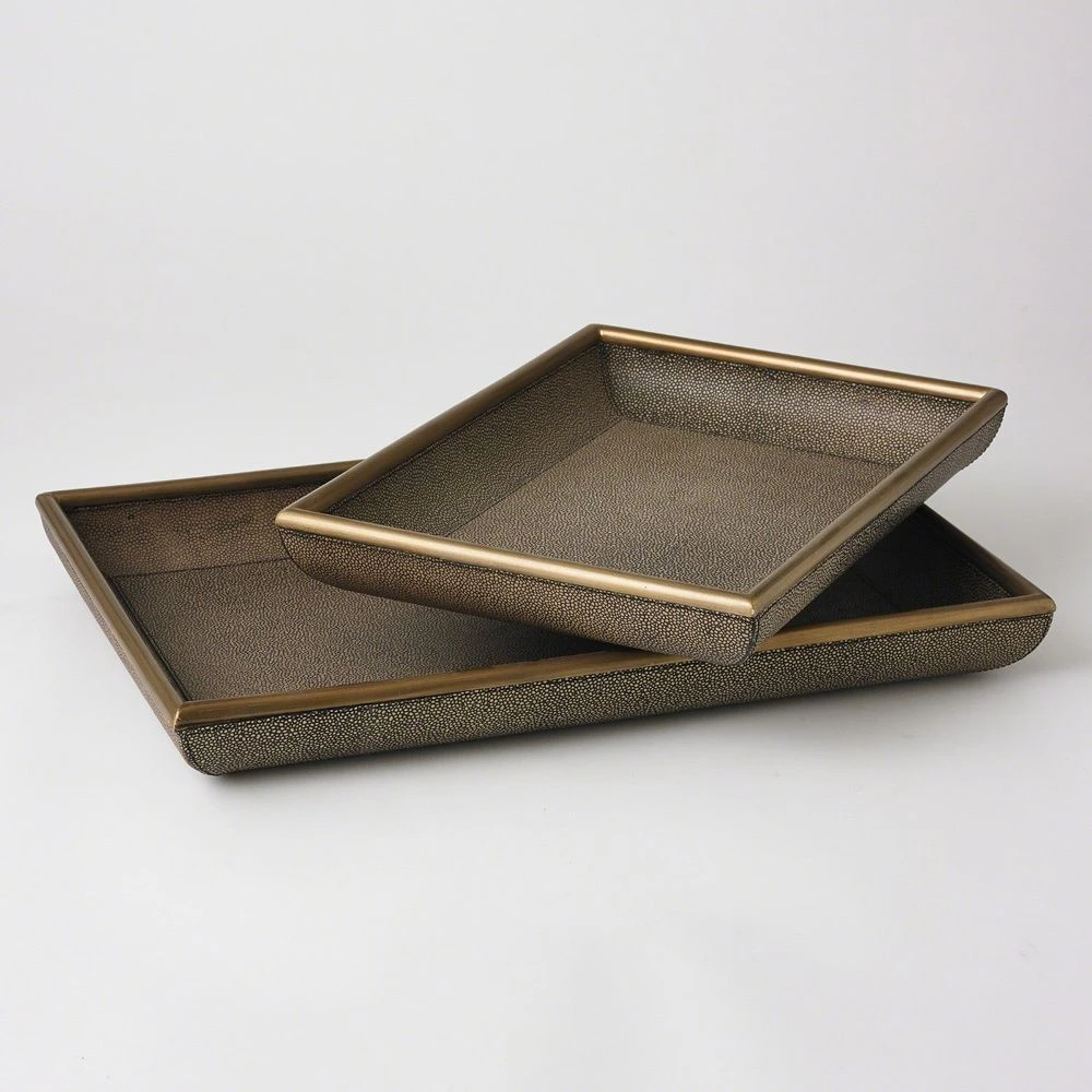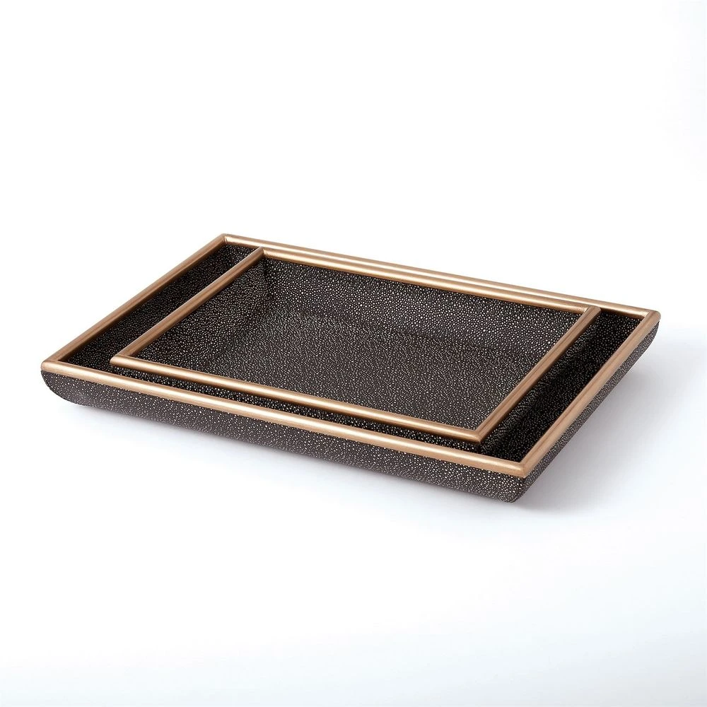 Description: Faux Shagreen Leather Trays with Wood trim. Available in two sizes.