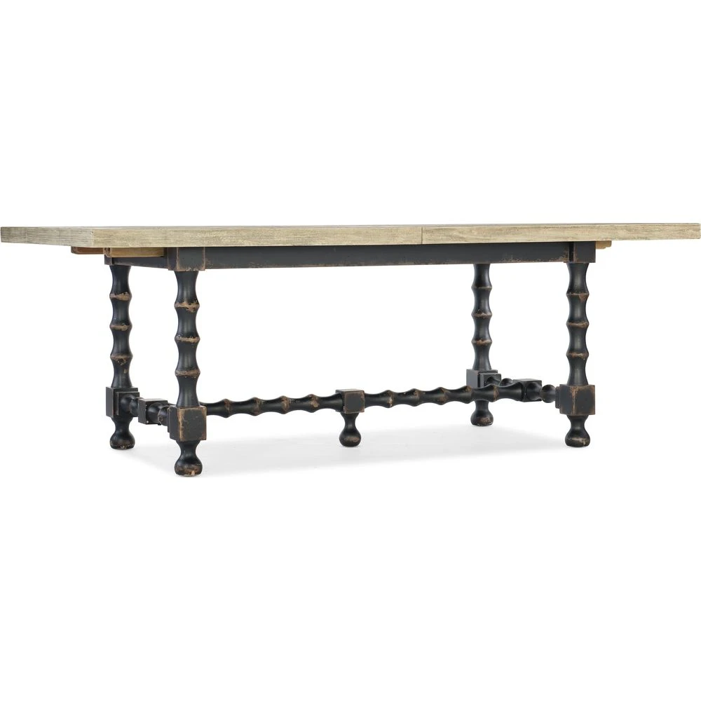 Be transported to a romantic, rustic Italian farmhouse as you dine around the Ciao Bella 84-inch Trestle Table. The base has turned legs and an exquisite black finish with hand-chiseling and wire brushing, and contrasts with a Flaky White top. The two 18-inch leaves extend the table to 120 inches, accommodating up to 10 guests. Beautifully crafted of Poplar Hardwood Solids with Pine Veneers. Inspired by the small farmhouses that dot the French and Italian countryside and have been in the hands of the same family for generations, Hooker Furniture introduces the rustic Ciao Bella Collection. The whole home collection is an eclectic mix of European farmhouse pieces that have the appearance of furniture that has been refinished multiple times as it has passed through the generations. Ciao Bella includes bedroom, dining room, occasional, home office and accent furniture, and features a finish called Timeworn Gray that accentuates the historical nature of European farmhouses – many of which include a variety of furniture styles that have been added by each generation of owners.