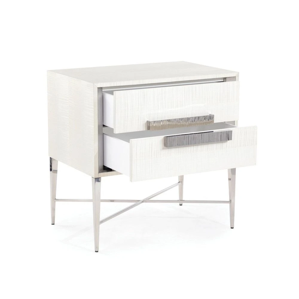 Description: This contemporary nightstand features two drawers and a brushed stainless steel base. The case has a dyed fiddleback sycamore veneer in arctic white with chamfered insets in pewter silver. Each drawer features a cast stainless steel handle with a textured design.