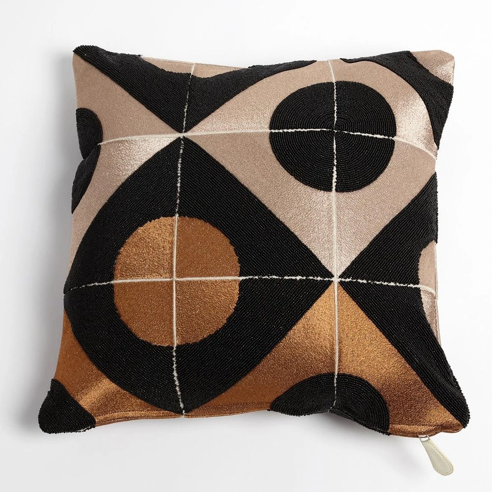 Solid metallic embroidery fills the entire surface of this beautiful pillow. The embroidery is interrupted by solid black fields of hand beaded shapes that help create the circles and squares of the design. The design is meant to mimic marquetry, inlaid work made from small pieces of variously colored wood or other materials used chiefly for the decoration of furniture. Our pillows are delivered to you with a 22 inch x 22 inch – 37 oz.