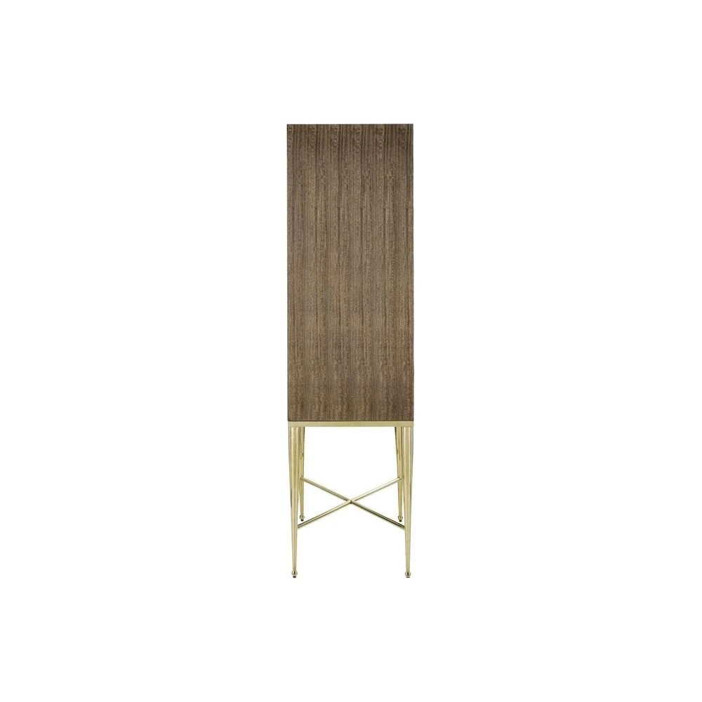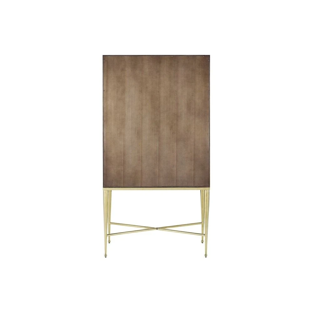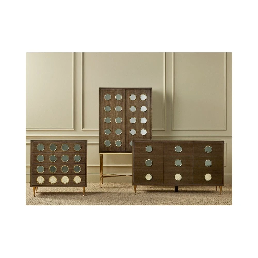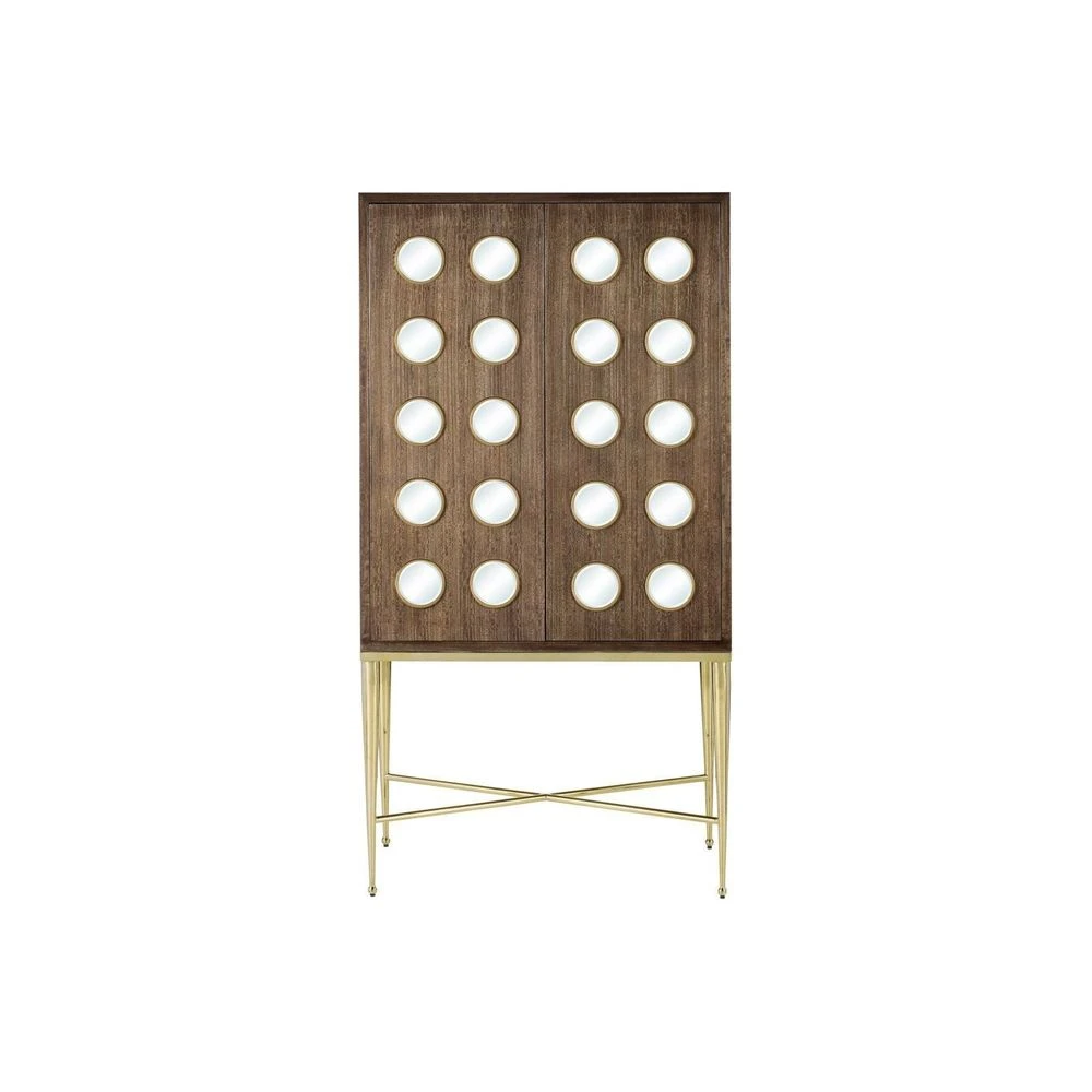Description: The Colette Bar Cabinet is made of poplar wood that is covered in Eucalyptus veneers with a handsome linear texture to them, heightened when finished in a tawny brown. Elevating the sophistication of the two-door cabinet is a high-gloss luster on the exterior. Interior details include a mirrored back, two glass shelves, an inset marble slab on the bottom surface, a pull-out tabletop for additional work/serving space, and a large drawer for storing accessories. The luminous beveled mirror accents on the doors and interior drawer, which sit proud on the surface of the cabinet, are surrounded by stainless steel rings in a polished brass finish to match the legs and the stretchers.