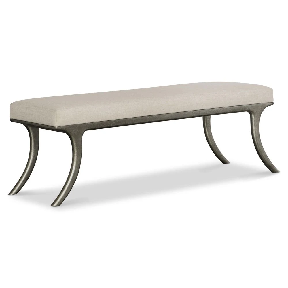 Description: The curved legs and upholstered seat of the Colton bench call to mind traditional forms, but the design is reimagined with a textured steel base that offers a more modern and minimalist look.