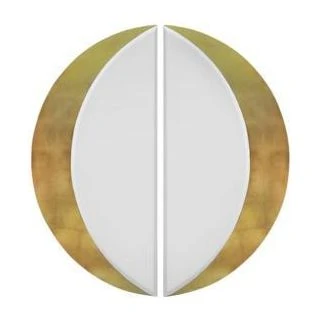The Concavo Mirrors display gorgeous curvature elevated through opulent tones. Two wooden frames contain beveled mirrors and depict semicircles with crescent-shaped accents in a gold coast finish along the sides, contrasted by a silver steel finish along the outside rim. These sophisticated pieces are installed with french cleats and can be displayed from both portrait and landscape positions.