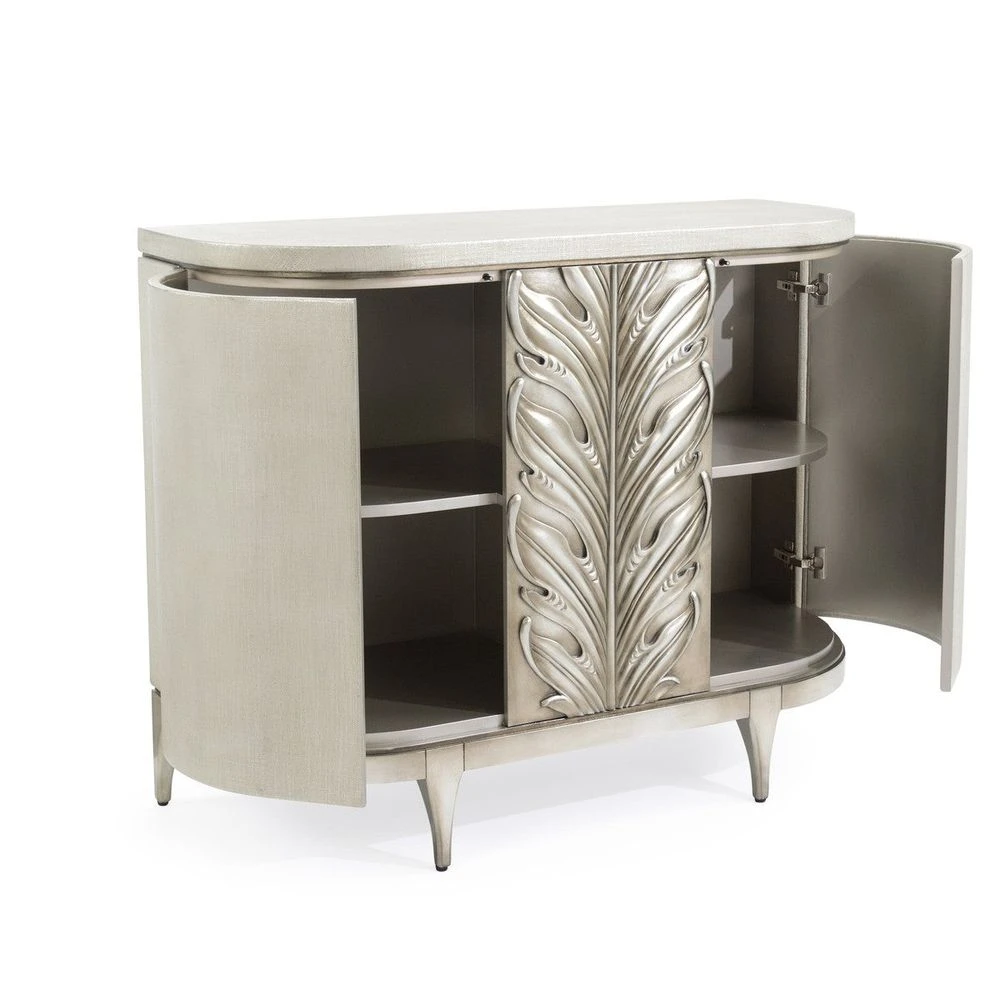 Description: An ode to the timeless elegance of Ancient Greek architecture, the Camden Chest features two push-latched doors with a beautiful acanthus leaf in Burnished Pewter adorning the center. The body of beech wood is enveloped in exquisite white linen, delicately accented with shades of silver along the top and bottom. This regal, sophisticated piece unlocks the true potential of your interior space through a tasteful combination of historic inspiration and modern design sensibilities.