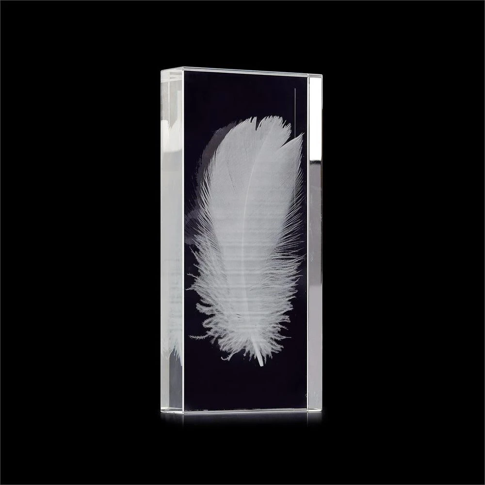 This stunning decorative accent displays a gorgeous white feather suspended within a rectangular cut of clear crystal.