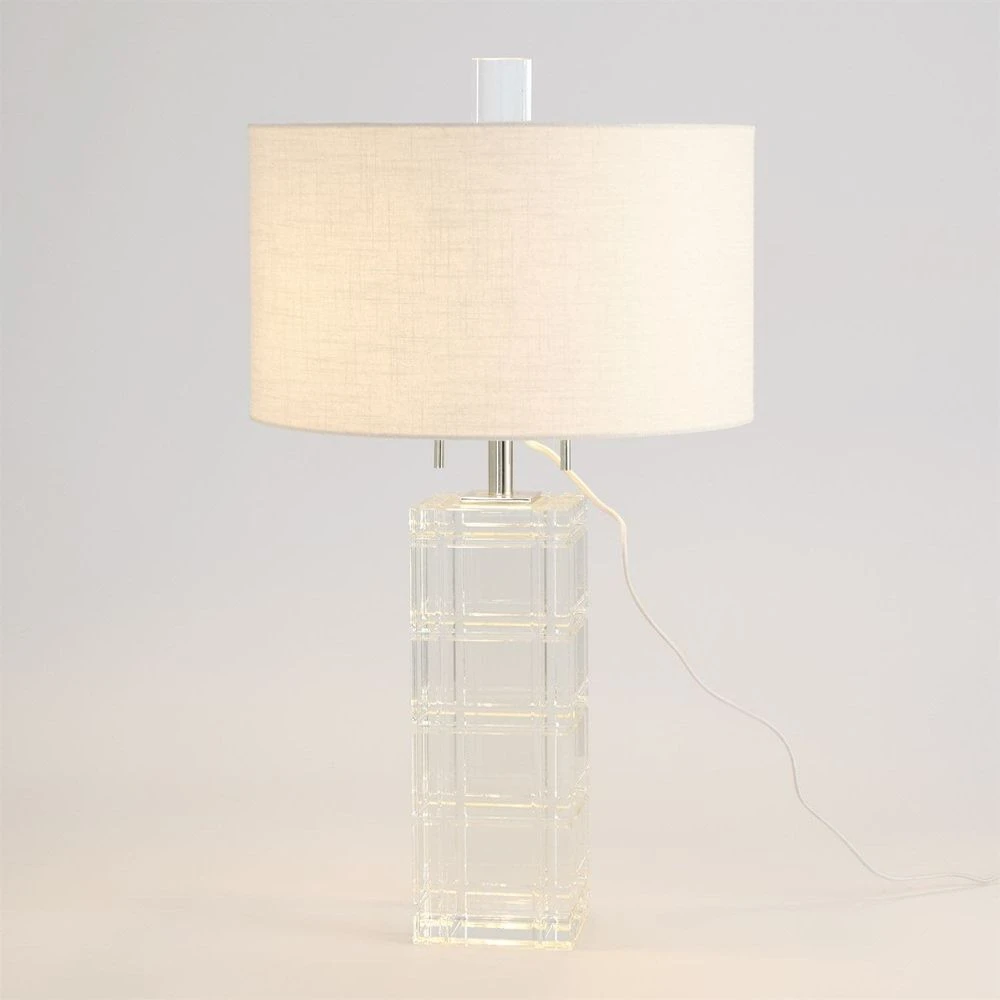 The Crystal Plaid Lamp is brilliantly cut and polished K9 crystal with a hardback white linen shade.