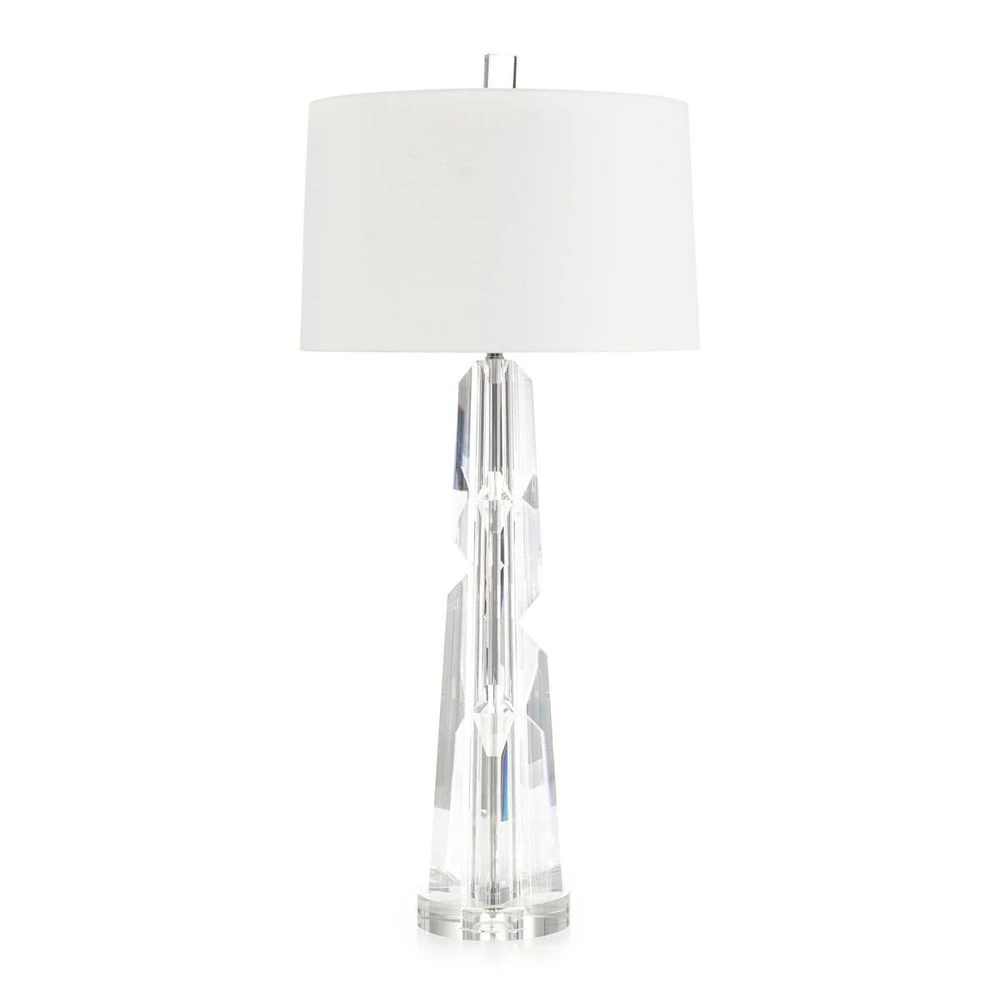 This gorgeous turnkey table lamp showcases a stunning body of crystal with triangular grooves carved into the sides. The base and finial, also of crystal, perfectly complement the transparent body to result in a sleek, modern statement piece. A slender rod of iron in a polished nickel runs through the body of the piece to act as the neck, providing playful juxtaposition and completing the look.