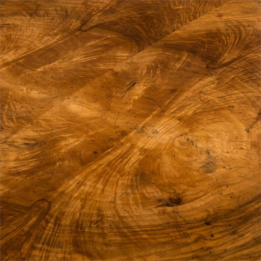 Exquisitely matched cerejeira veneer to the top and U-shaped supports are aged by a traditional French polish technique. The front rail conceals a pen drawer, while the supports have ebonized plinths.