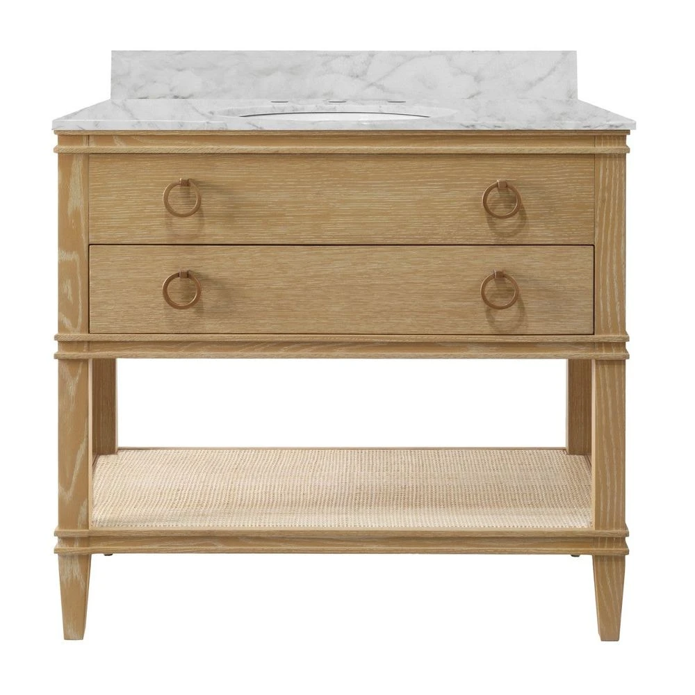 Description: The Cutler CO bath vanity in cerused oak is a celebration of craftsmanship and natural beauty. The Cutler’s emphasis on a seamless user experience is enhanced by the incorporation of soft-close glides and antique brass ring hardware. Finished in a timeless cerused oak, the vanity showcases handwoven cane shelf, white with grey accents Carrara marble top, and porcelain sink. The Cutler CO is a cut above the rest!
