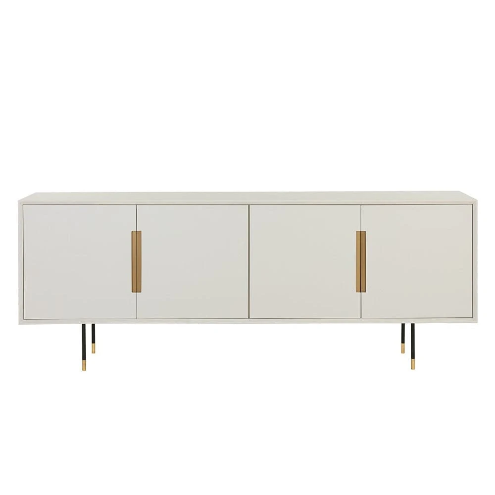 Polished and sleek, this sideboard boasts a stellar modern design. Features a wooden frame in a modern cream finish. Includes four pull-type drawers with rustic bronze steel accents. Completed with black powder coated steel legs and gold metal footcaps. Can also be used as a media console and cabinet. Coordinating dresser and nightstand also available.