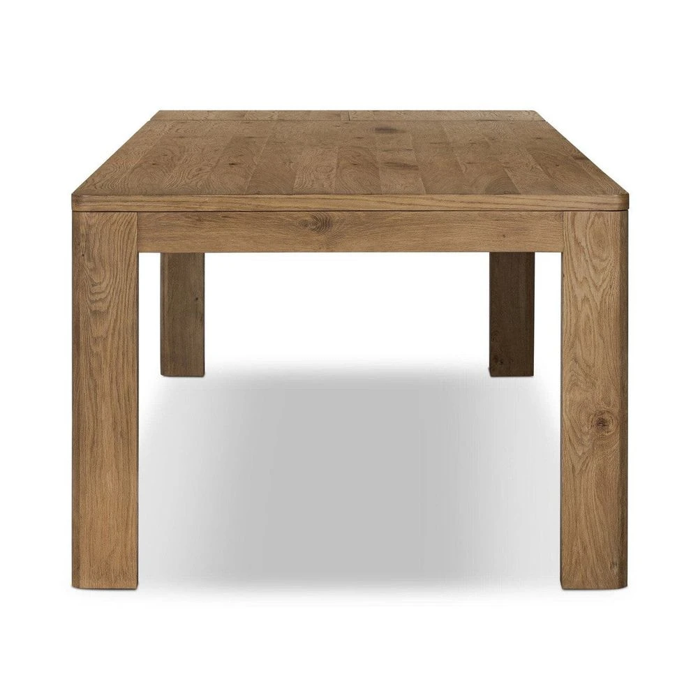 Description: Made from solid and resawn oak with a light, worn finish, a self-storing extension creates space for extra guests. Equipped with four lockable wheels for easy extension to 116″.
