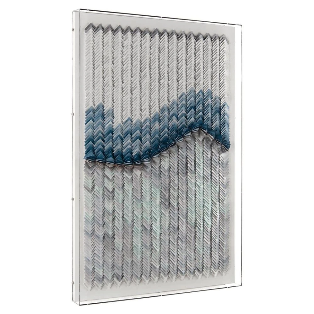 The detailed placement of vegan leather squares in shades of white, grey, and blue creates an interesting three-dimensional chevron design with an illusion of a flowing river. This original artwork by Daniel Fey is encased in an acrylic box.