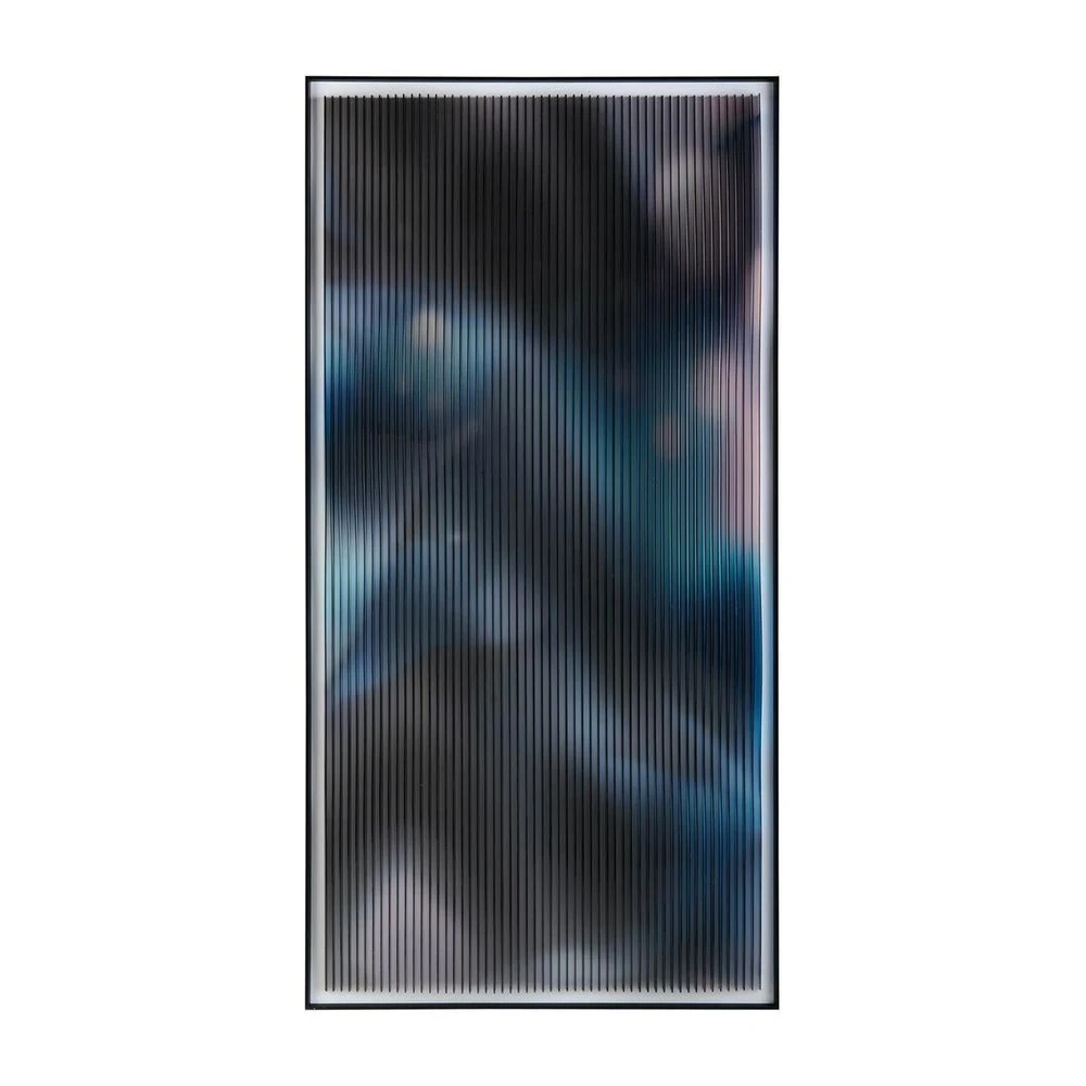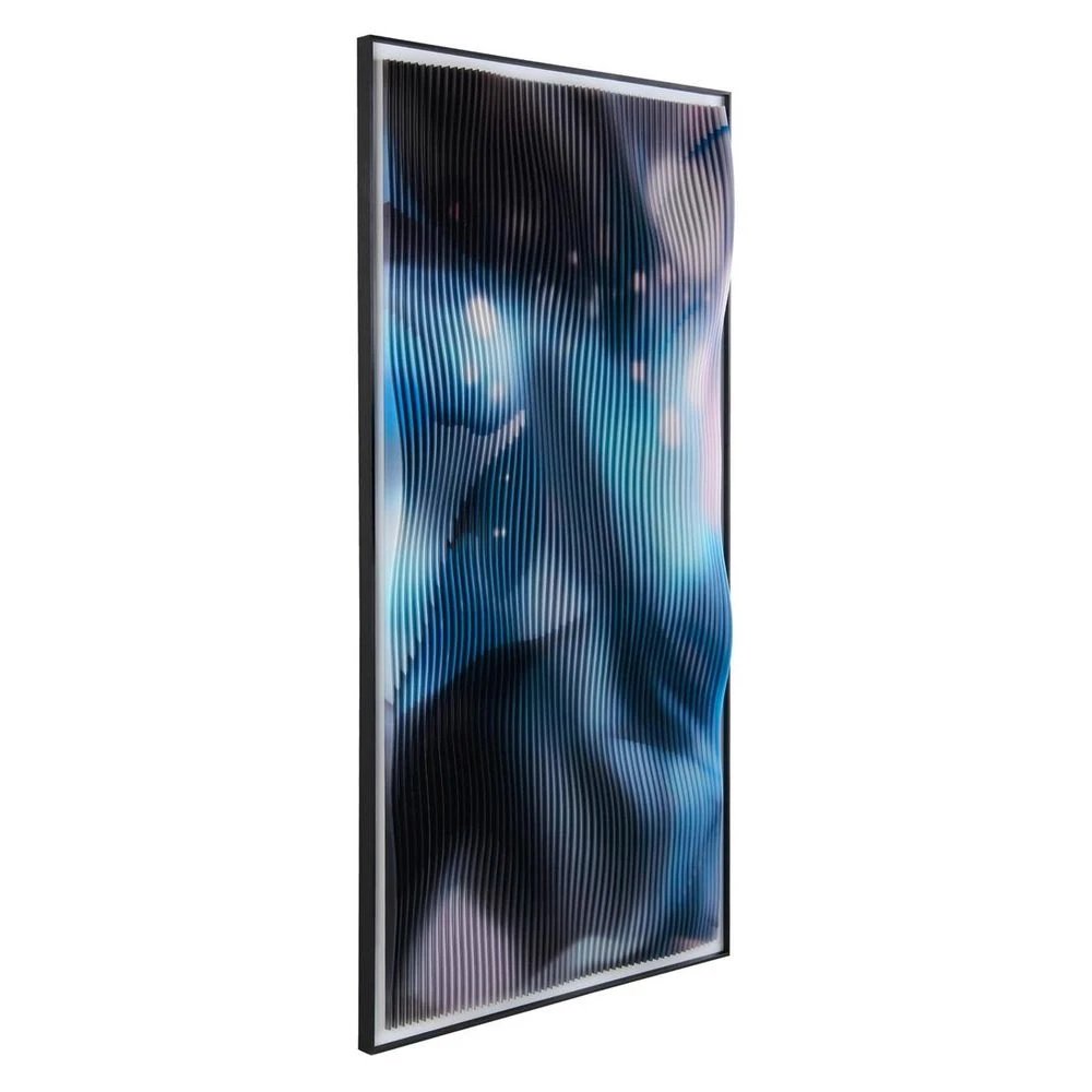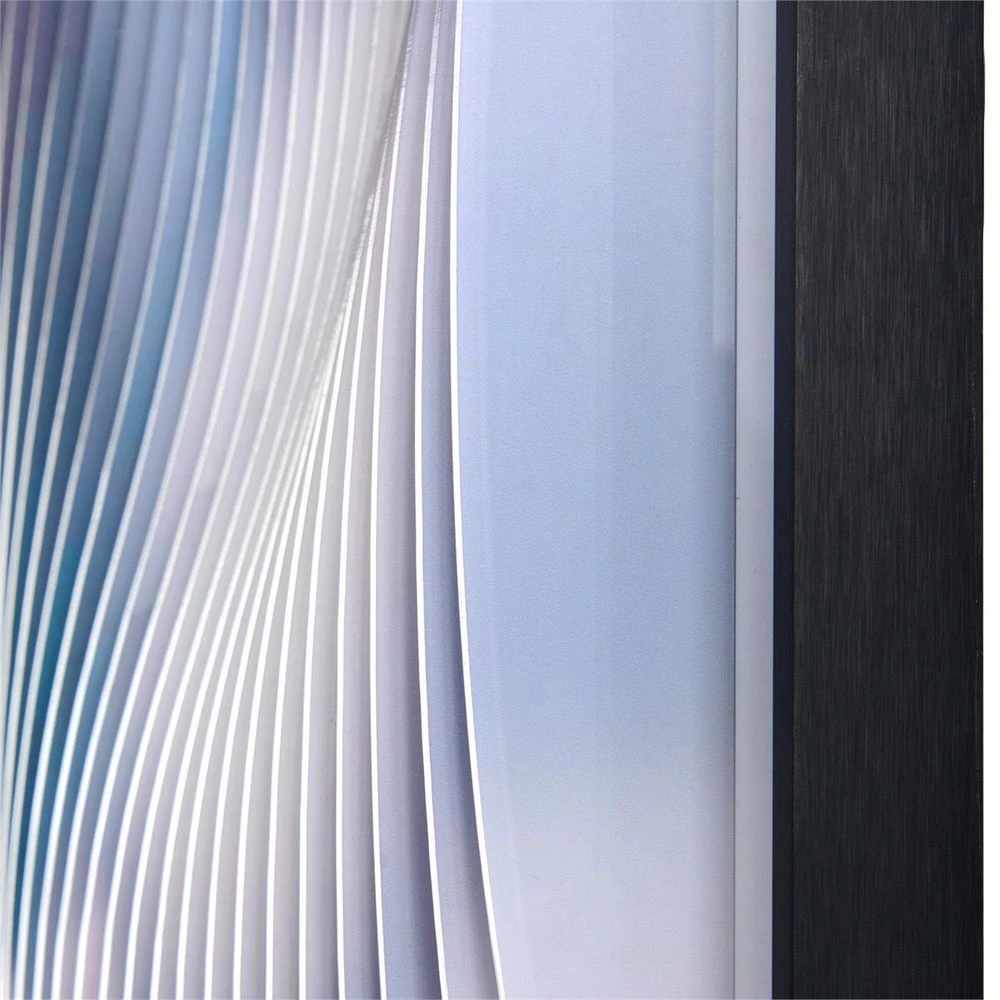 With varying shades of navy, blues, and white, the dramatic peaks and valleys of these acrylic panels create an aurora of intrigue. This original artwork by artist Daniel Fey is finished in a black molding.
