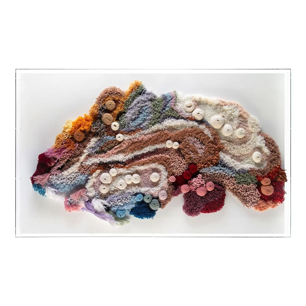 Exotic Plumage by artist Daniel Fey is a magnificent tribute to some of Earths most majestic creatures. Hand-made from fabric on canvas, the piece showcases a variety of different shapes and colors that form a gorgeous feather. The piece imbues an interior space with vibrant tones and rich textures, serving as a wonderful focal point. This wall art is encased within a clear acrylic box and is affixed with keyhole hangers.
