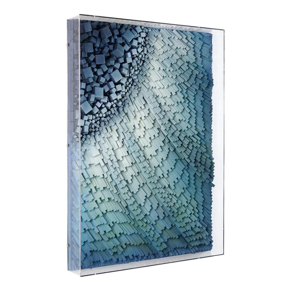 This structural piece by Daniel Fey displays a flowing perspective with the interaction of movement, shapes, and shadows in blues, greens and white. The art is surrounded by an acrylic box.