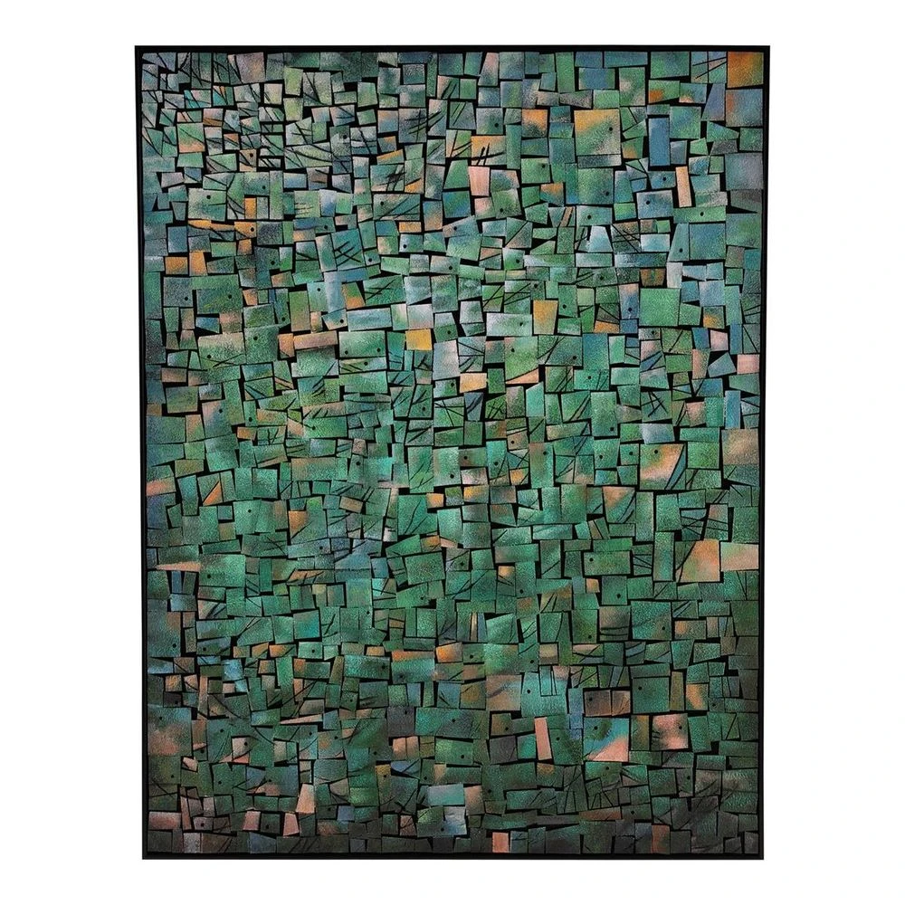 Tones of the Forest by artist Daniel Fey is a breathtaking mosaic of painted wood blocks, showcasing verdant green tones with accents of yellow and blue. This stylish dimensional wall art is displayed from a black floater frame.
