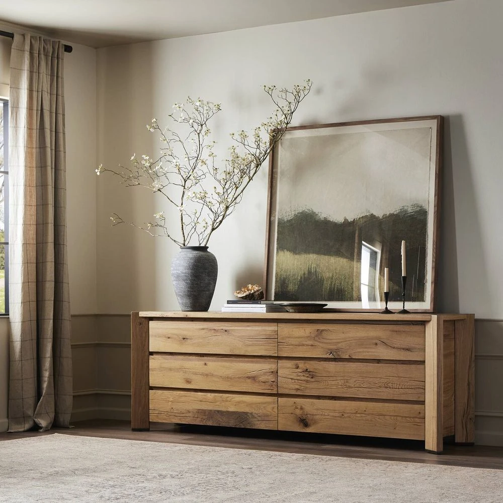 Designed by Thomas Bina and Ronald Sasson, a design partnership blending both modern minimalist and Brazilian influences. This grand-scale dresser is crafted from natural reclaimed French oak with plenty of graining, cracking and movement across the drawer fronts. Detailed with angled legs and exposed joinery on the top. Drawers are fully finished on the interior so each piece is beautiful inside and out.