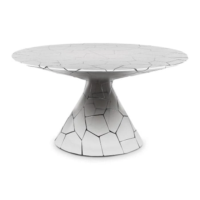 These pieces are truly “crazy cut.” Each piece of stainless steel is cut by hand, each shape unique, to fit together in this beautifully puzzled surface. Amazing craftsmanship and the luster of a chrome finish make these pieces the shining star of any space.