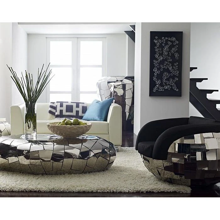 These pieces are truly “crazy cut.” Each piece of stainless steel is cut by hand, each shape unique, to fit together in this beautifully puzzled surface. Amazing craftsmanship and the luster of a chrome finish make these pieces the shining star of any space.