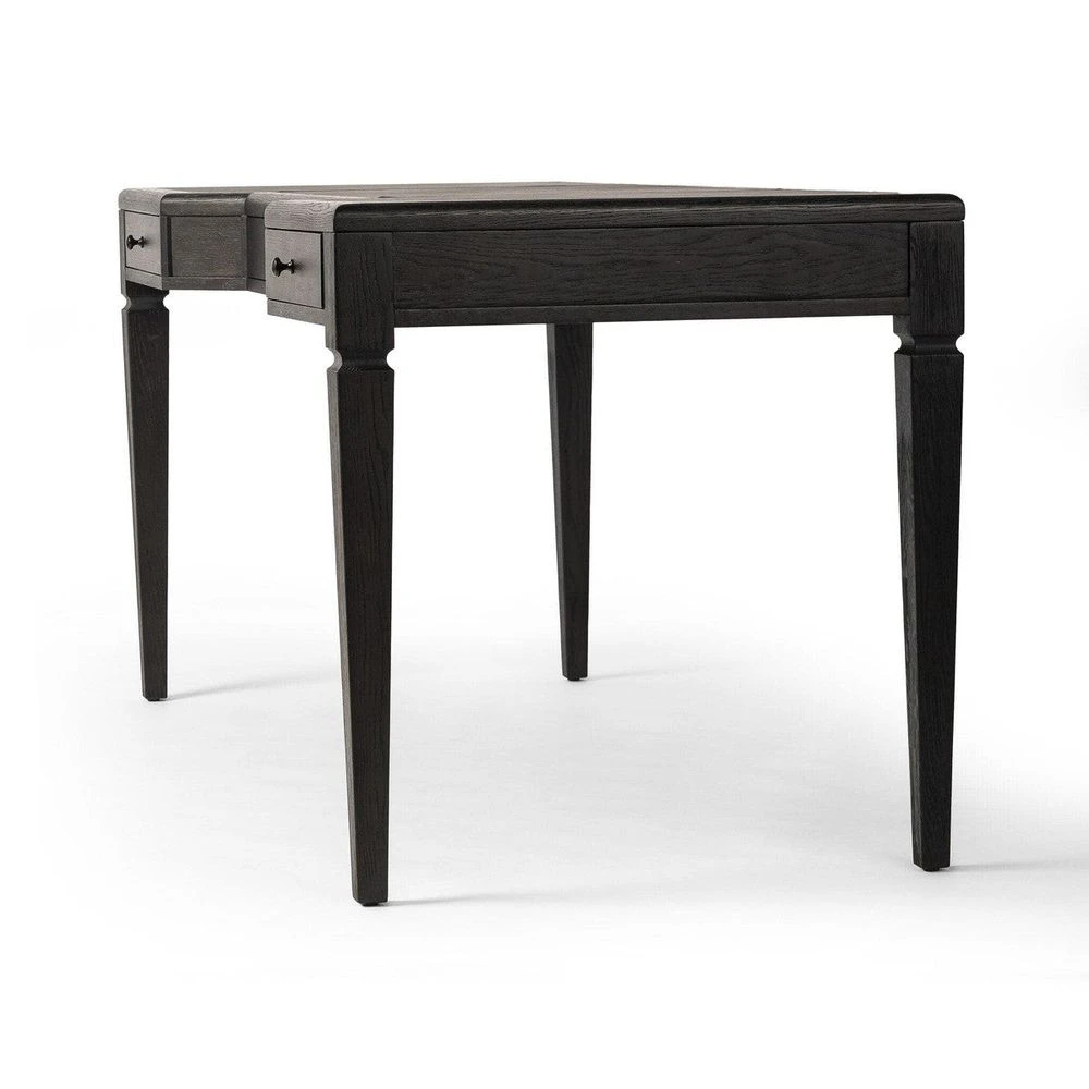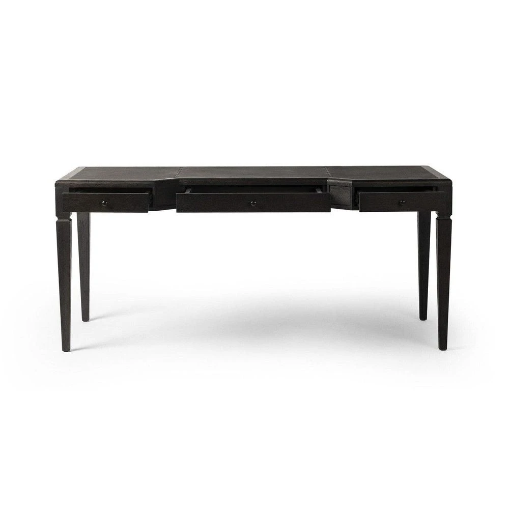 Description: This refreshed directoire-style desk pairs a 100% top-grain leather inset top with a unique reverse breakfront and recessed center drawer. Finished in distressed black oak, it offers the workspace a classic yet updated feel.