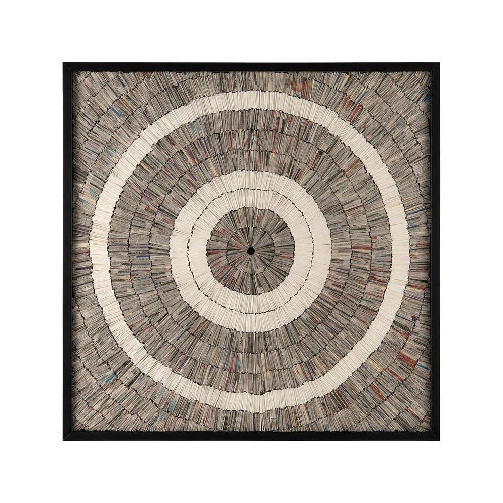 This paper art by David McDowell features folded, gathered, and pleated watercolor paper in tones of grey and white, creating a sculptural perspective. The art is displayed under glass and surrounded by a contemporary black frame.