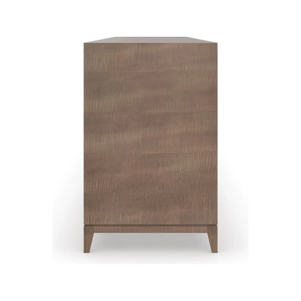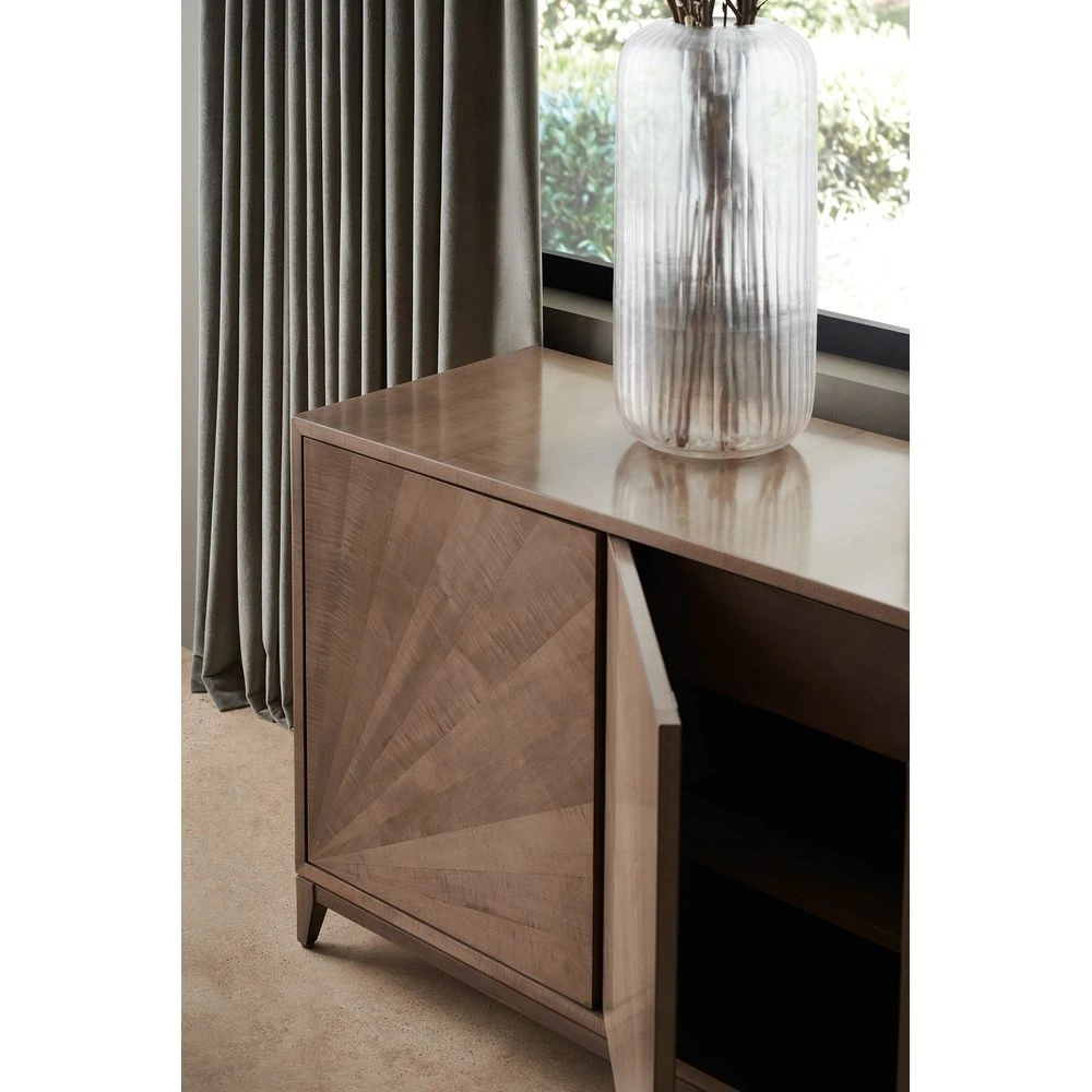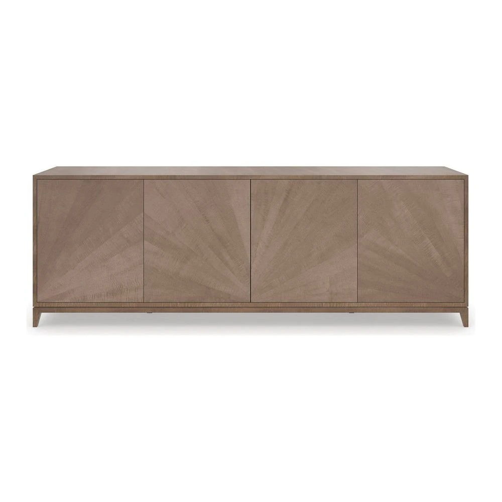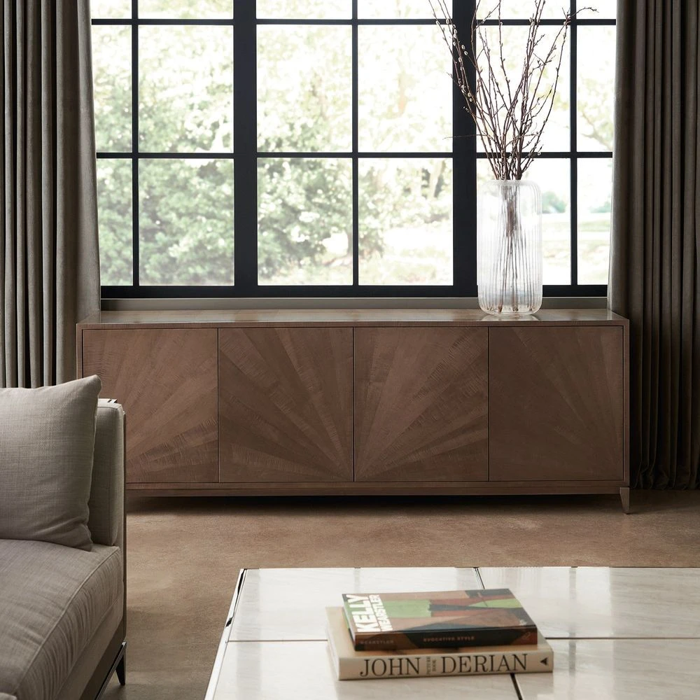 A rich Mocha finish calls attention to Elegant Tiger Maple veneers in a radiating starburst pattern. This amply sized credenza features four interior drawers and three adjustable shelves behind touch-latch doors for a clean-lined storage option with endless style potential. Makes a striking first impression in entryways, living, and dining interiors.