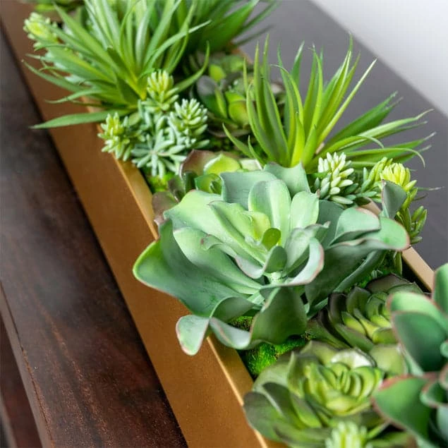 Our custom satin gold painted wood table planter highlights a variety of botanicals. Need this item quicker and less cost? Choose any of our in-stock containers and we can adapt. Planter dimensions, colors and textures can be customized in our Chicago studio. Let us prepare a customized quotation for you. We will substitute components if any are out of stock at time of purchase giving the same overall appearance. Protect table surface. Indoor only.