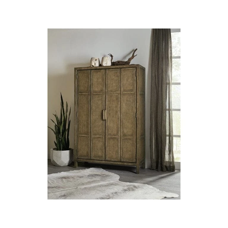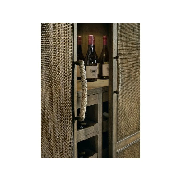 - Material: Pecan Veneers, Rattan, Glass, Puck Light, Self-closing Undermount Drawer Guides
