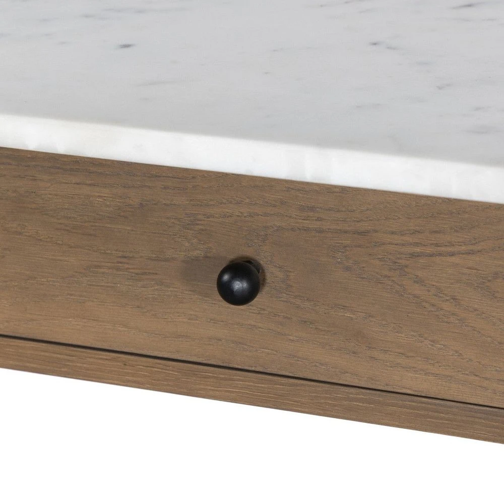 Antique turn shape-inspired with a fresh geometric twist. Finished in toasted oak and paired with white marble, it offers functionality with three drawers on each side, plus a spacious bottom shelf for bonus storage.