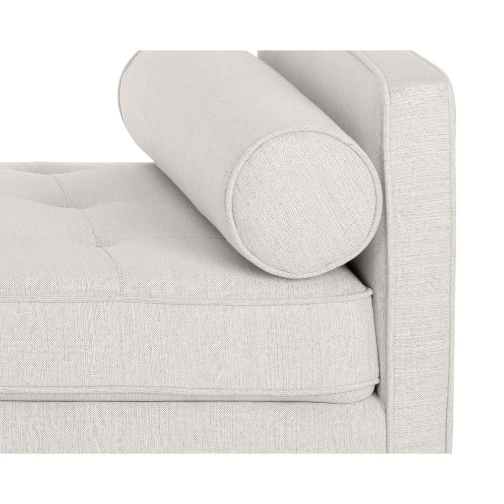 This attractive mid-century designed bench is a timeless addition to any space. Upholstered in mina ivory fabric with summary tufting and piping detail. Finished with a natural birch wood base. Also available in tobacco tan faux leather with black birch wood.