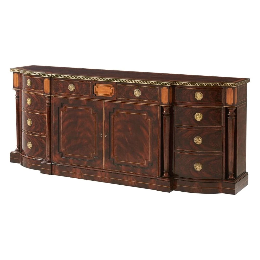A fine mahogany veneered and yew burl banded buffet, the break bowfront top with an ebony and brass inlaid edge, above an arrangement of four frieze drawers and central cabinet doors enclosing an adjustable shelf, flanked by two sets of three graduated drawers and turned and tapering columns, on line strung plinth base.