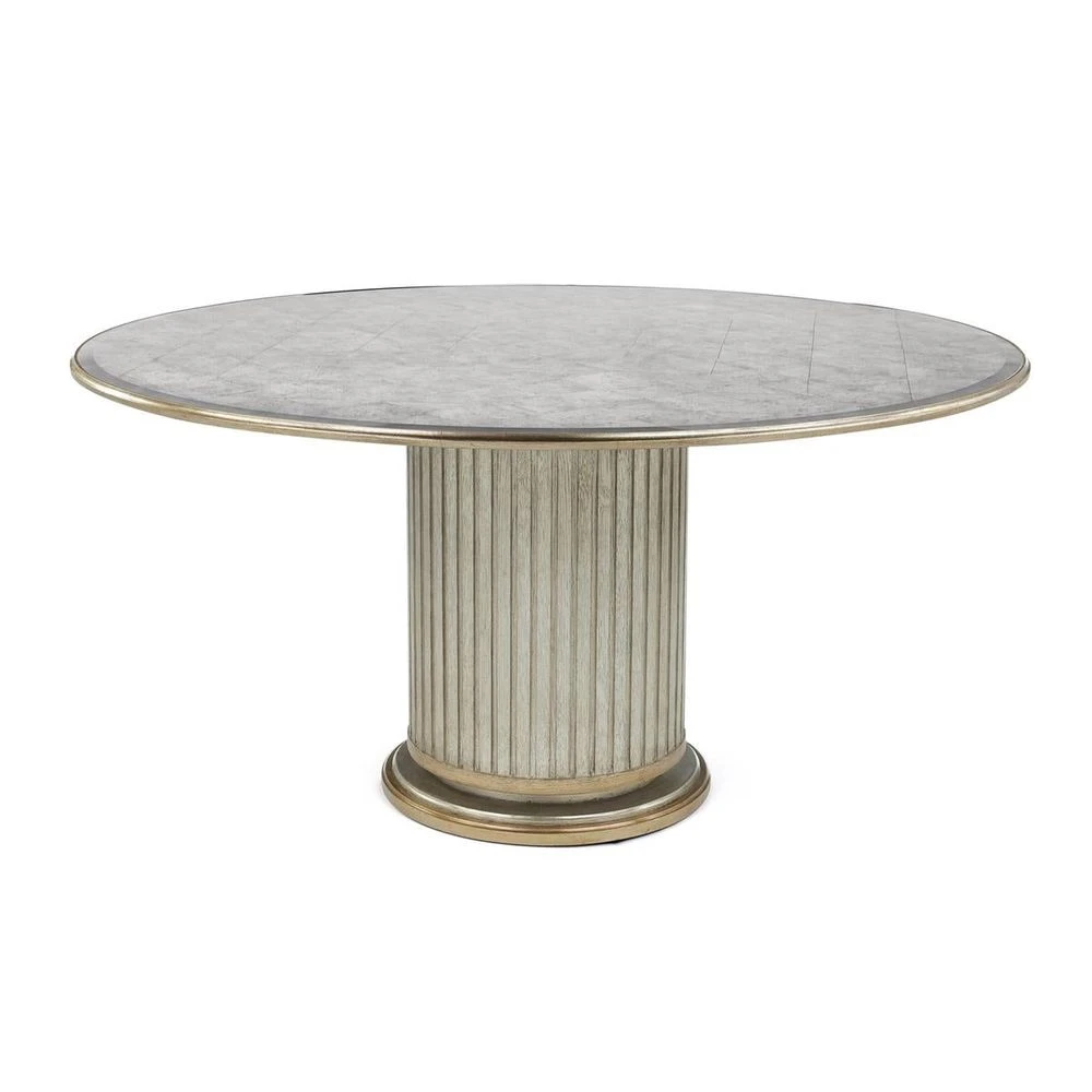 The Dorien Dining Table takes cues from ancient architecture, translating it through the lens of chic modern design. Crafted from oak wood, the ornate base is reminiscent of Doric Greek columns with a proud silhouette and subtle fluting. The column with steel fittings is finished in Silver White and accented with touches of Valyrian Gold, matching the rounded base and accent border of the tabletop. A large, beveled glass tabletop features stunning, providing contemporary charm to this classic look.