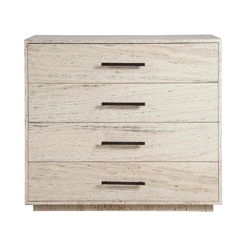 The Dove Drawer Chest, with its quartet of drawers, showcases the exquisite uniqueness of White Travertine, alive with vibrant textures and distinct markings. Dark bronze hardware accentuates its depth, elevating the chest to a piece that not only stores but also mesmerizes, blending effortlessly into spaces that celebrate sophisticated layers and natural elegance.