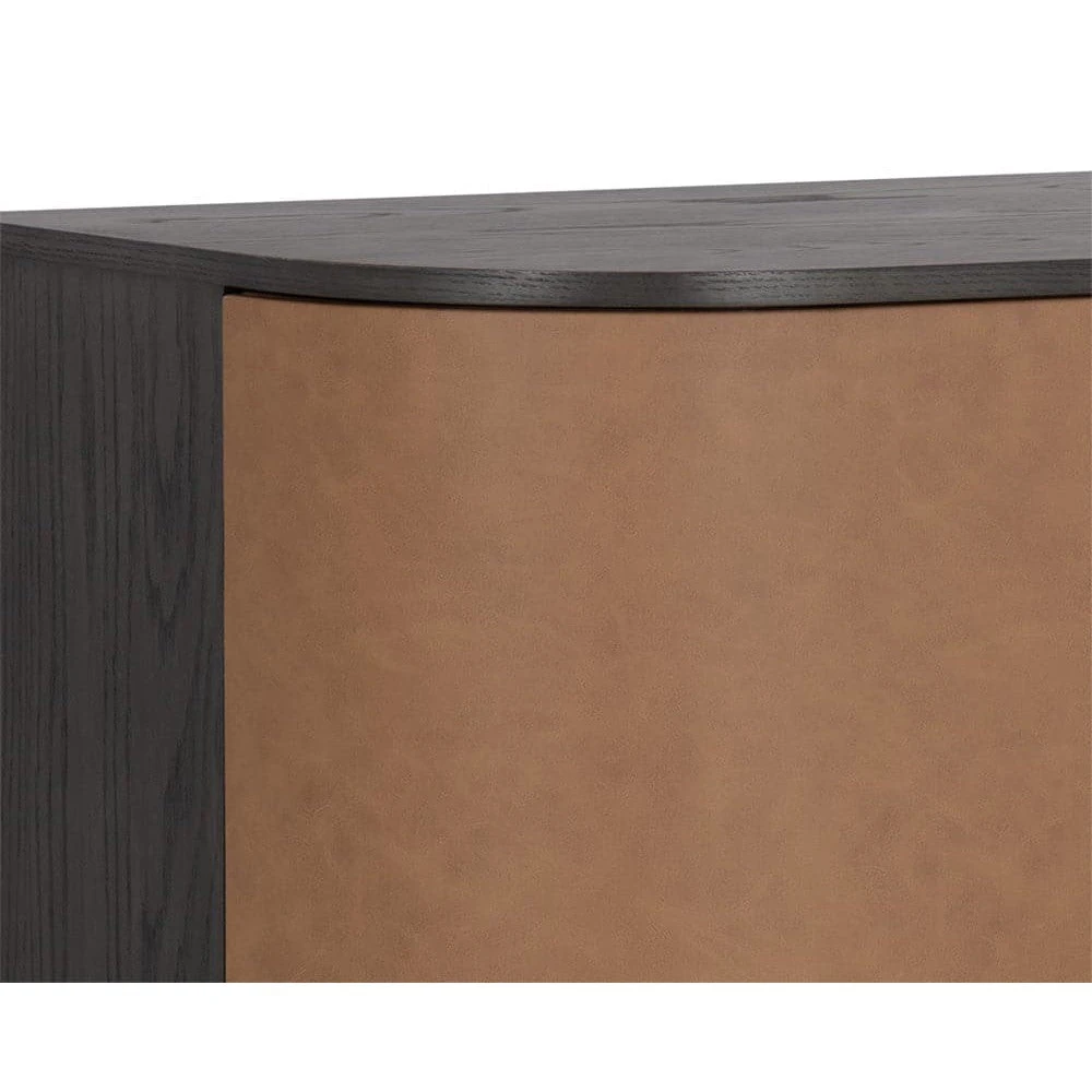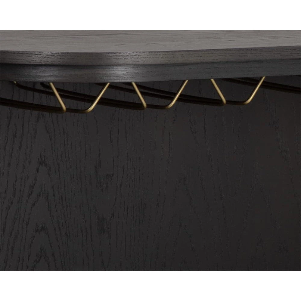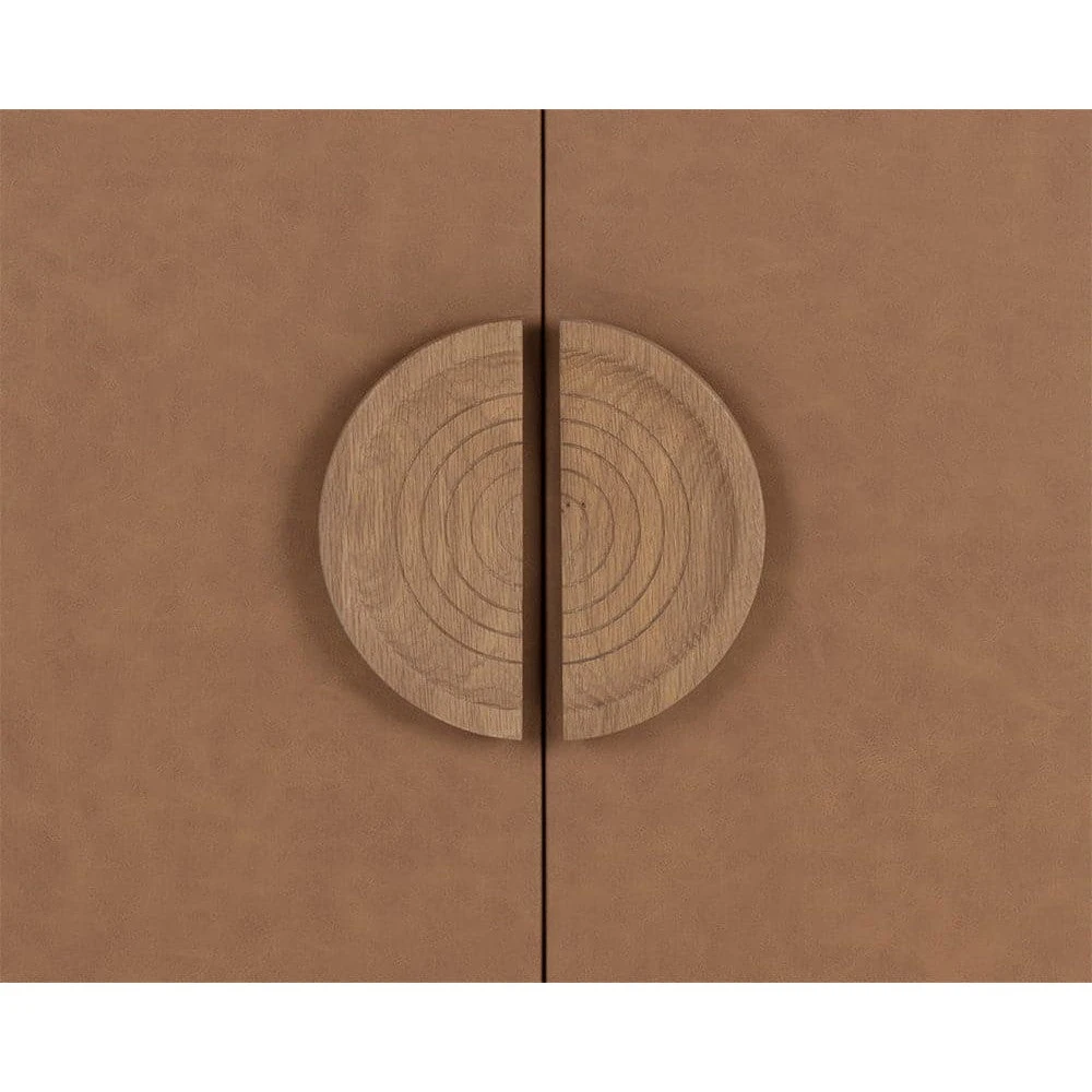 Mid-century flair and expert craftsmanship give the Dresden Bar Cabinet a handsome form. Constructed from smoke grey oak veneer and rubberwood with milliken cognac faux leather on the doors for an intriguing look. Textured circular handles in solid oak wood add a global flair. This cabinet features built-in storage for wine and stemware. As wood is an organic, porous material, these pieces will contain natural variation of texture and may also exhibit fine indentations and cracks. Wood pieces will also display a disparity of colour and grain, and visible knots and burls that add to the character of each piece.