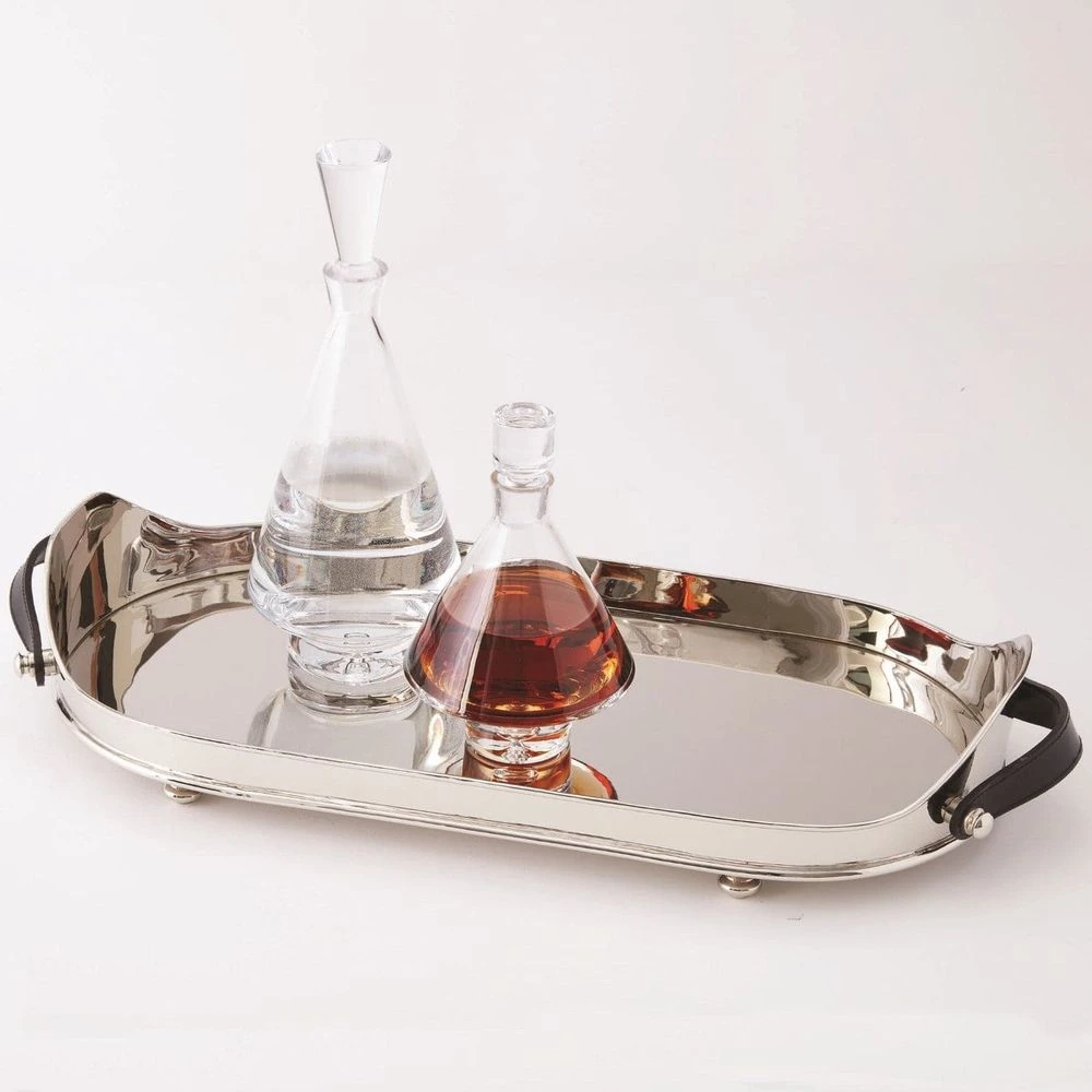 Elegant polished nickel brass tray with leather handles. Perfect for entertaining or displaying collectibles. Note the decanters are sold separately.
