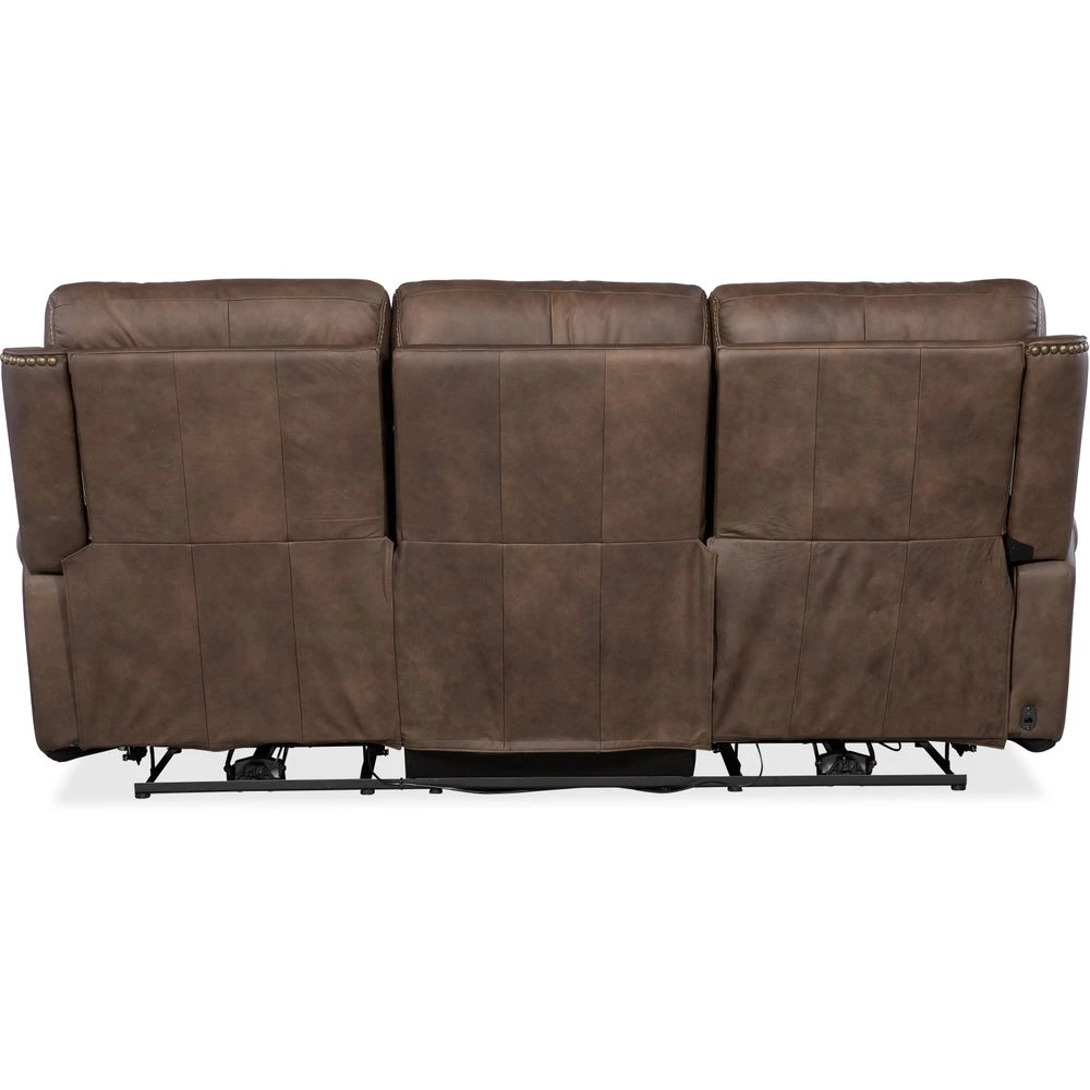Description: Plush and oh-so-inviting, the Duncan Power Sofa with power headrest and lumbar support is the ultimate in comfort. Featuring plush seat cushions and a bustle-style back, rolled arms and nailhead trim, it has a USB port and pop-out arm panel with a hidden metal cupholder. The two ends recline all the way back into the “zero-gravity” position, to give you a sensation of weightlessness with no pressure points. The sofa is upholstered in the semi-aniline top-train Kalahari Bark leather.
