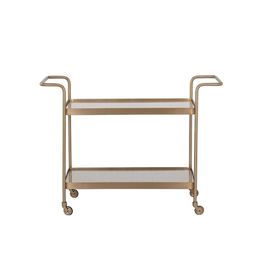 The Durva Bar Cart features a classic silhouette made from mixed materials. Clear tempered glass is placed on top of two natural rattan shelves to give the piece a relaxing coastal feel.