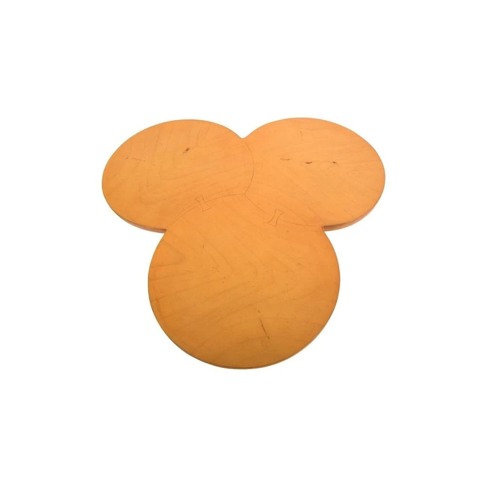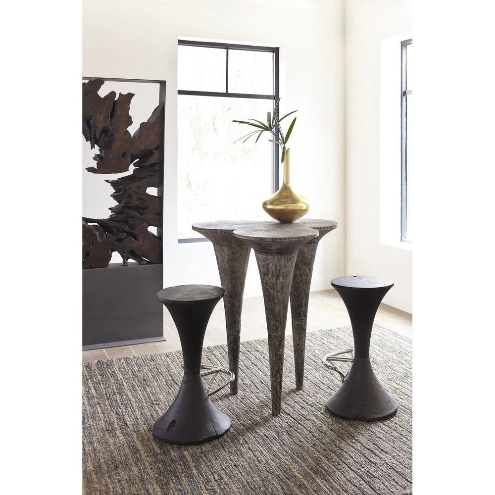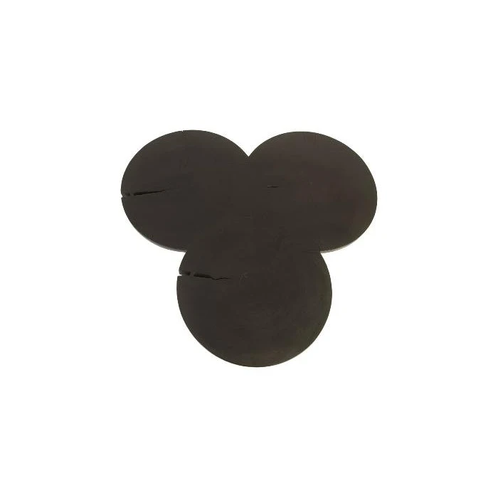 Carved from solid chamcha wood, an acacia species native to Thailand, this table sits on three slender legs. Three circular conjoined tops, accented with butterfly joints, make a functional surface. Charred on the outside and sealed for protection, this black finish is sleek and sophisticated. The stone-like patina adds warmth with the celebrated uniqueness of the beautiful wood grain.