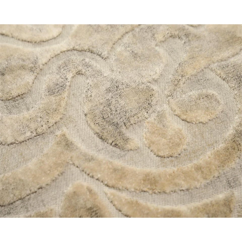 A contemporary dining side chair with an oval back is shown in a burnished silver finish and upholsered in a damask brown fabric.