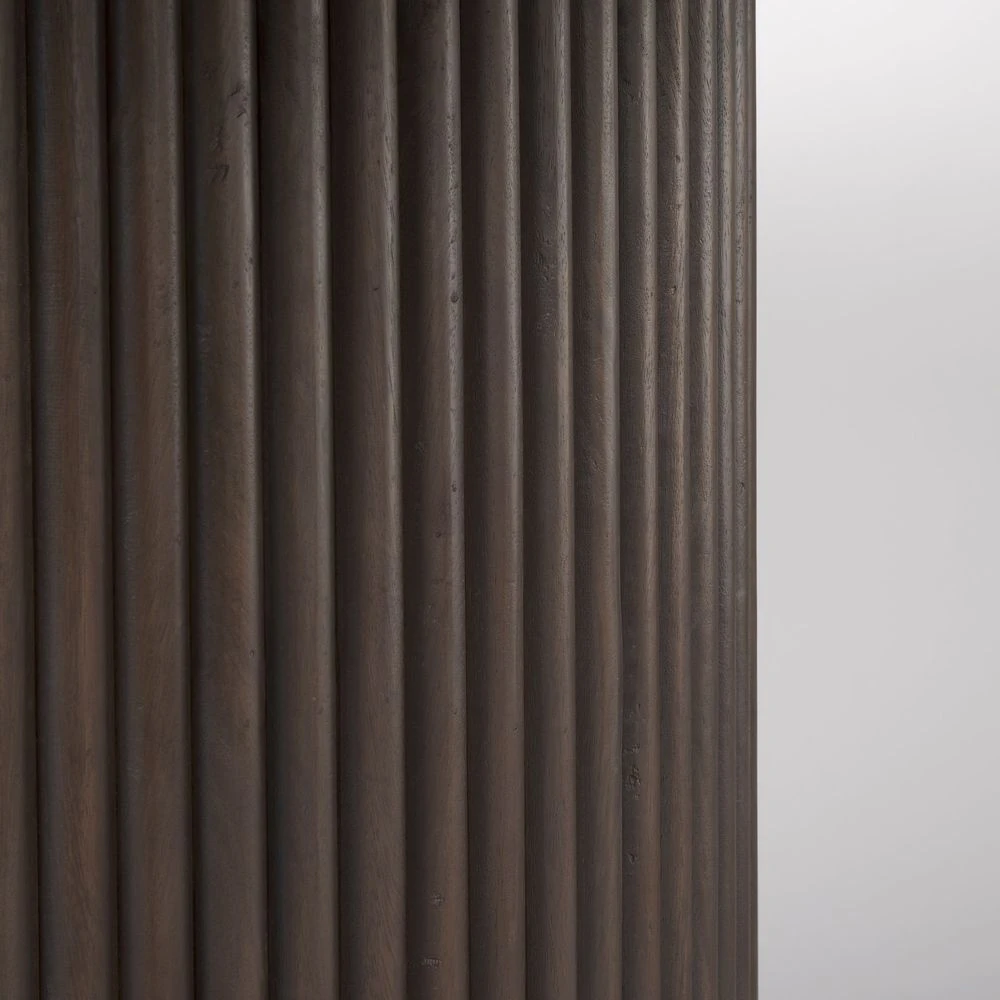 Description: A stunning, contemporary dining table made from a dark brown, solid mango wood that features a smooth round top and a fluted round base