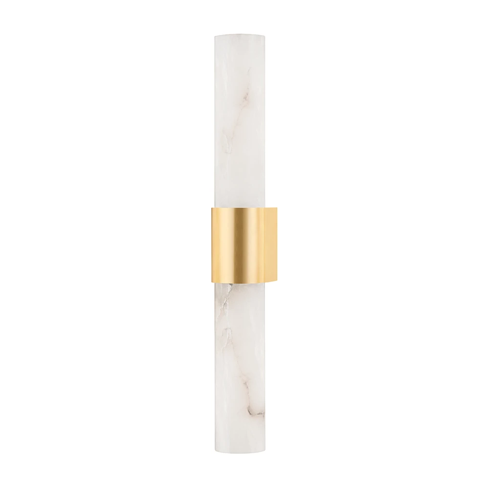 The very definition of minimalism, less is truly more with Ellington. The sculpted metal collar doubles as a backplate, attaching the sconce directly to the wall without the need for any additional adornment. The real focus of this fixture is the alabaster tube shade. Equally as beautiful unlit, the alabaster gives off a gorgeous, soft glow when filled with light. This smooth and stylish sconce comes in aged brass or polished nickel finishes.