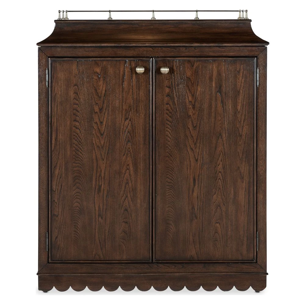Description: In a classic and classy silhouette, the Dukes Bar Cabinet is functional and chic. Crafted of Elm Veneers with a rich dark finish, it has a gold metal gallery back on the top, two doors with magnetic catches and a scalloped apron around the bottom. Behind the doors are three wine glass racks, one adjustable wood shelf and an open storage area. There’s a pullout drawer for bottle storage that holds up to 8 bottles, and a hidden top drawer with finger pulls and removable black felt liner.