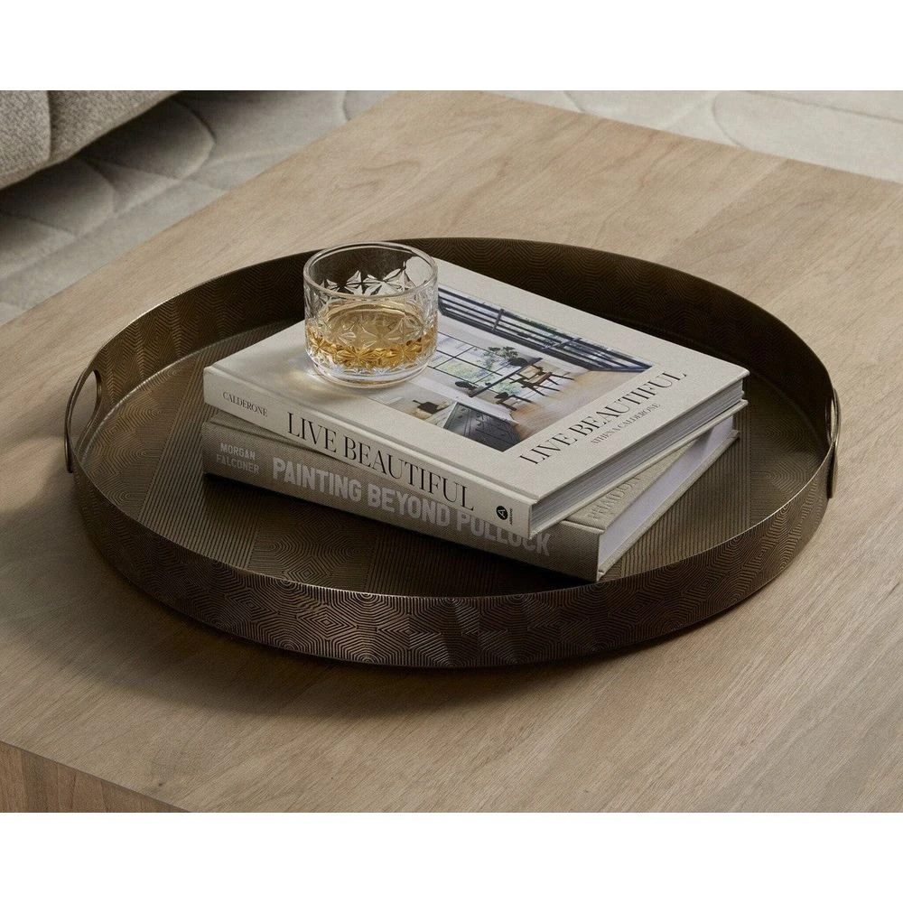 - Description: Serve up some style. Finished in a beautifully warm brass, a decorative iron tray features hand etching for eye-catching allure. Perfectly sized for serving cocktails or coffee table styling.