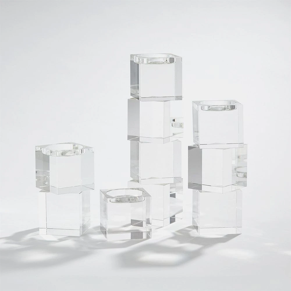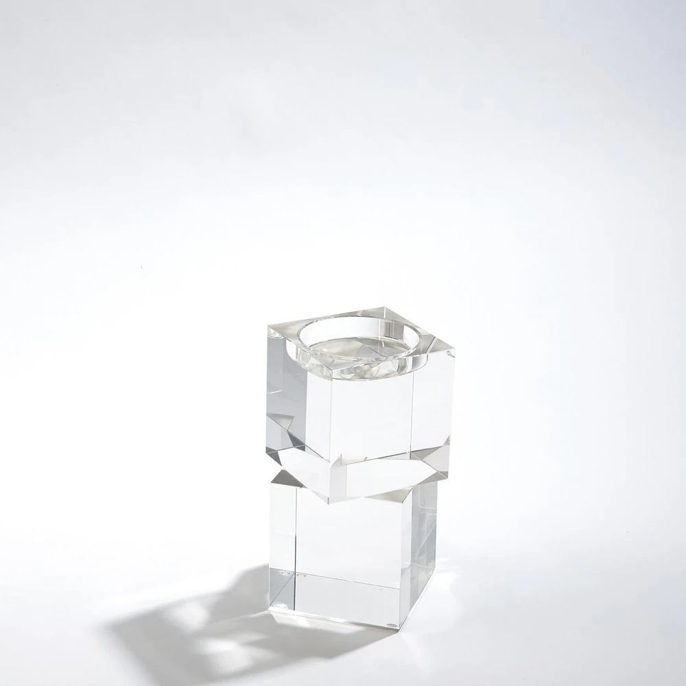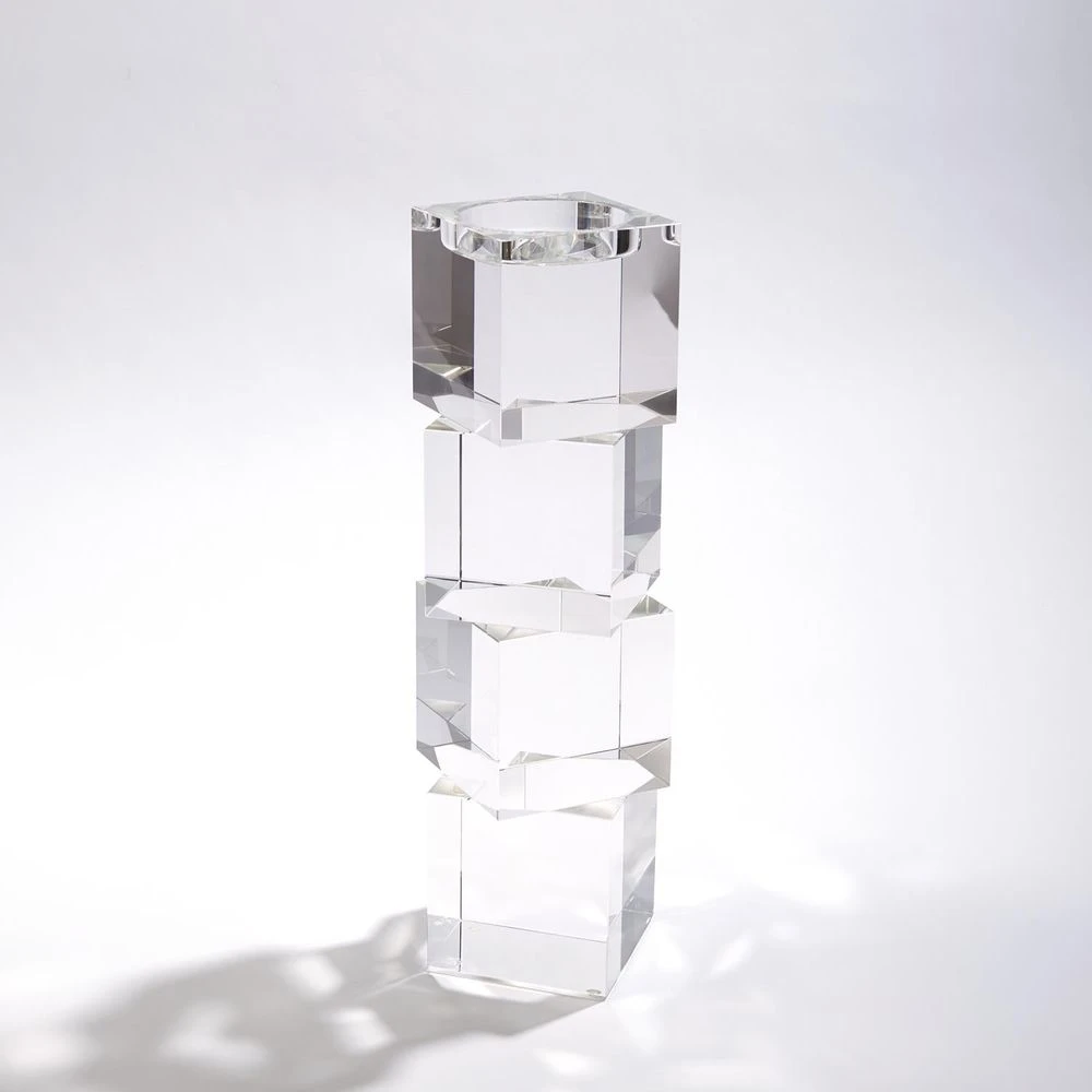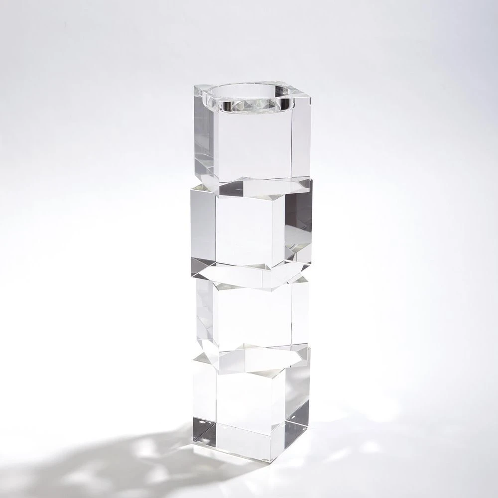 Description: Polished lead crystal cubes are stacked in a stair step to create over scale graceful candleholders. Please do not place in direct sunlight, crystal can magnify the light of the sun and potentially cause a fire hazard.