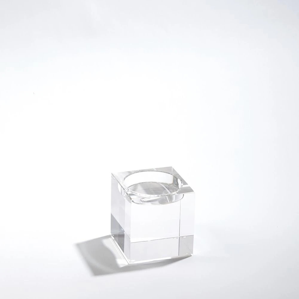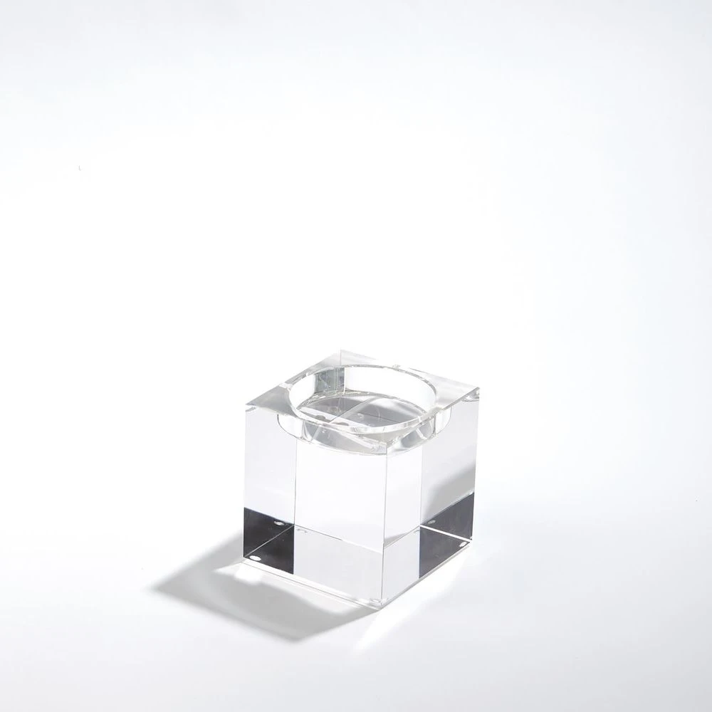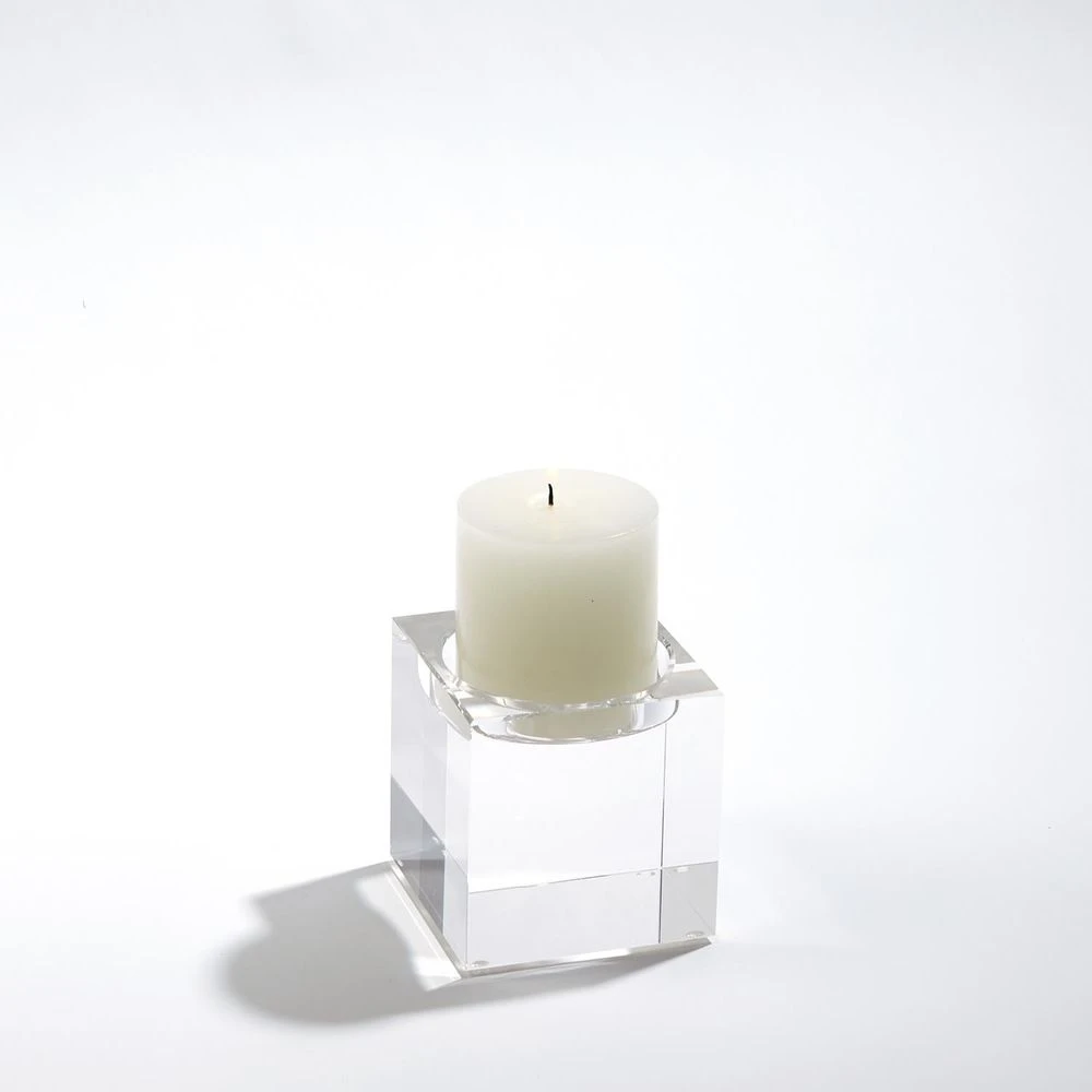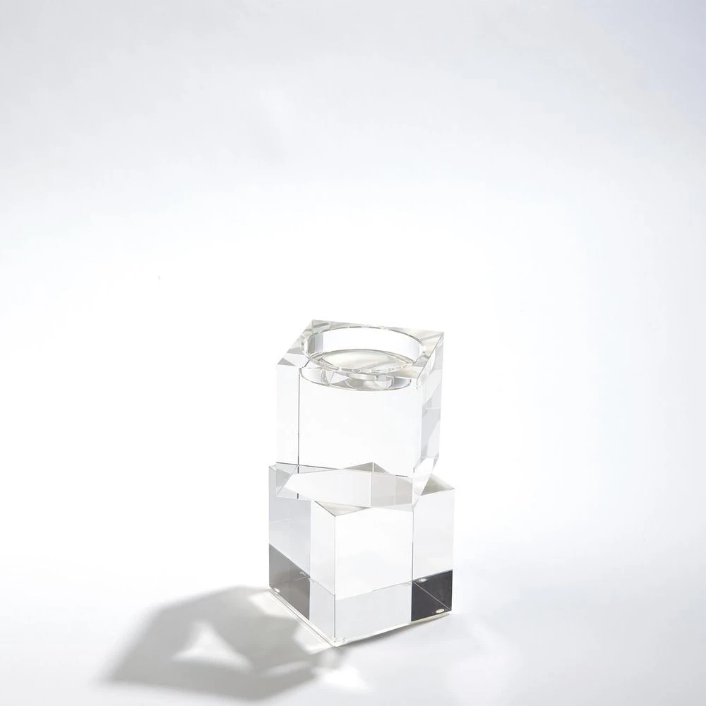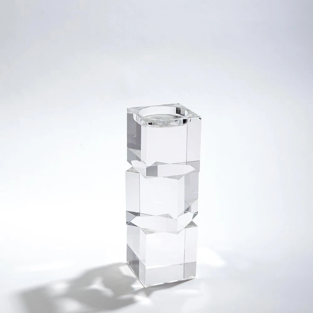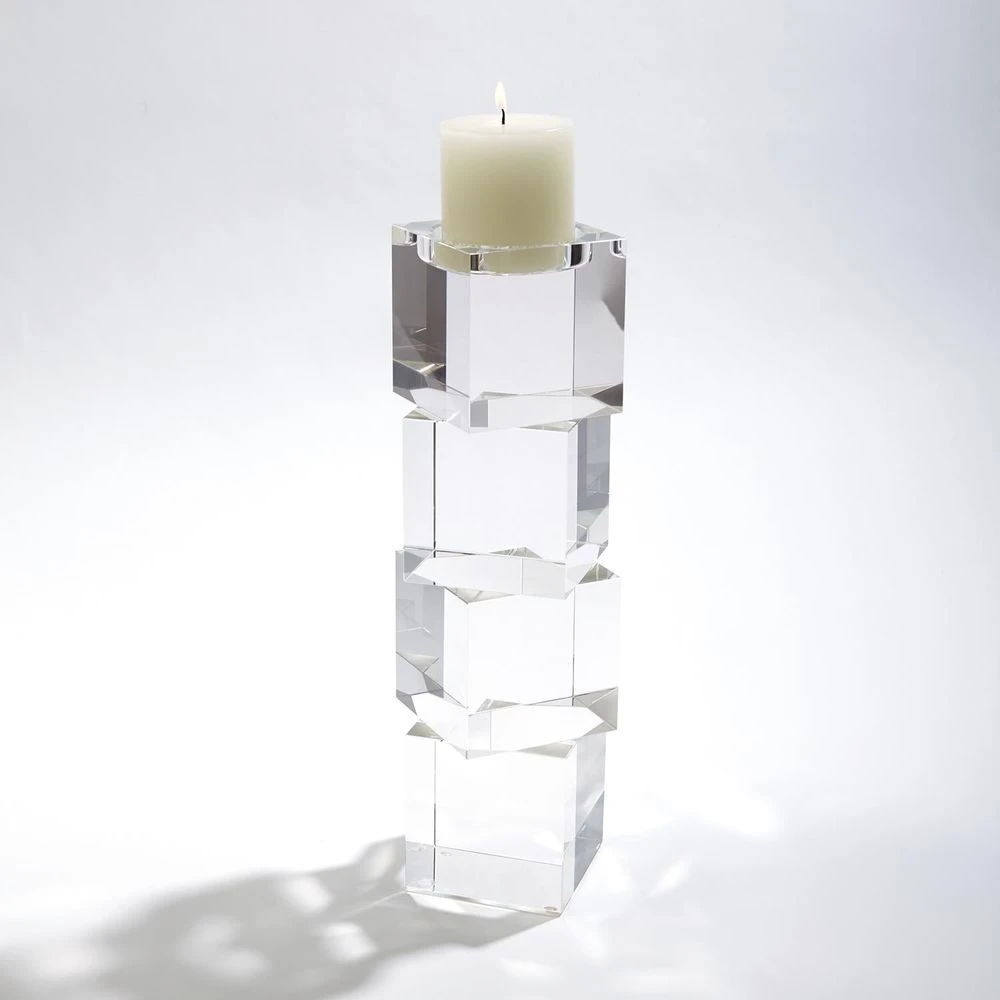 Description: Polished lead crystal cubes are stacked in a stair step to create over scale graceful candleholders. Please do not place in direct sunlight, crystal can magnify the light of the sun and potentially cause a fire hazard.