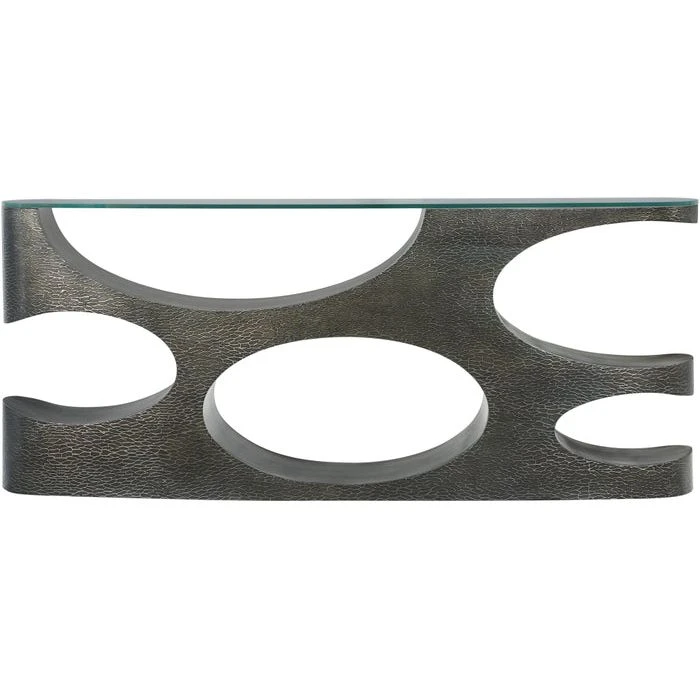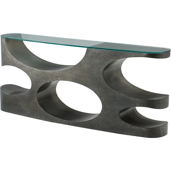 A pleasing contrast of geometric forms and textural carvings. The Essence Metal Console possesses an exquisite glass top above a metal base.