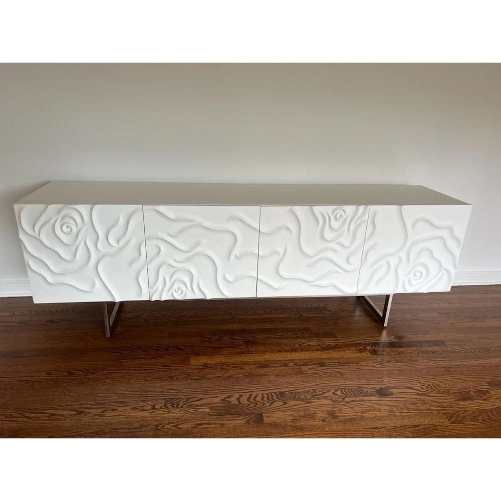 - Behind paired center doors is one adjustable/removable shelf, one drawer with hand cut-out and one grommet hole in back panel